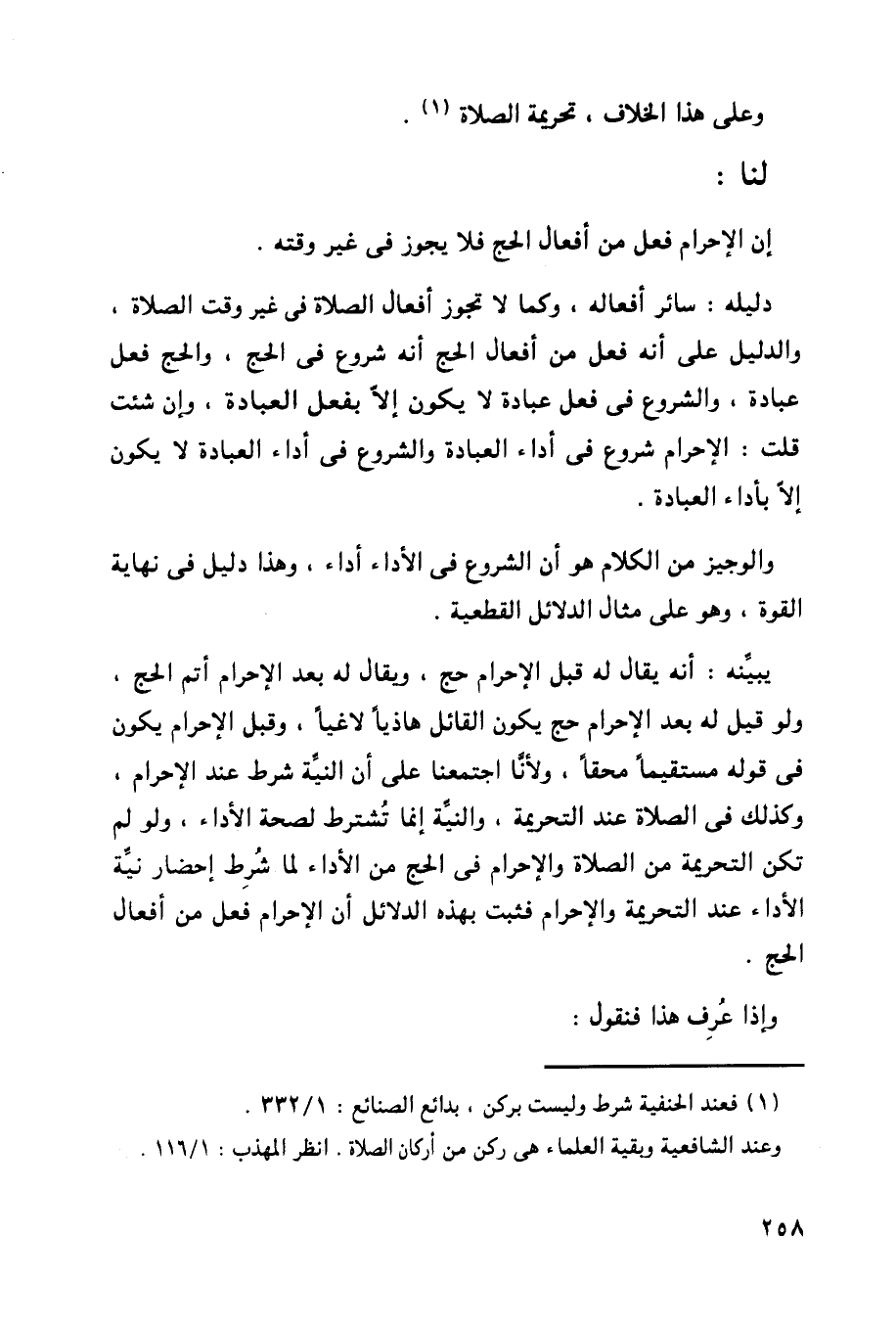 يبينه: أنه يقال له قبل الإحرام حج، ويقال له بعد الإحرام أتم الحج، ولو قيل له بعد الإحرام حج يكون القائل هاذياً لاغياً، وقبل الإحرام يكون في قوله مستقيماً محقاً، ولأنا اجتمعنا على أن النية شرط عند الإحرام، وكذلك في الصلاة عند التحريمة، والنية إنما تشترط لصحة الأداء، ولو لم تكن التحريمة من الصلاة والإحرام في الحج من الأداء لما شرط إحضار نية الأداء عند التحريمة والإحرام في الحج من الأداء لما شرط إحضار نية الأداء عند التحريمة والإحرام فثبت بهذه الدلائل أن الإحرام فعل من أفعال الحج.