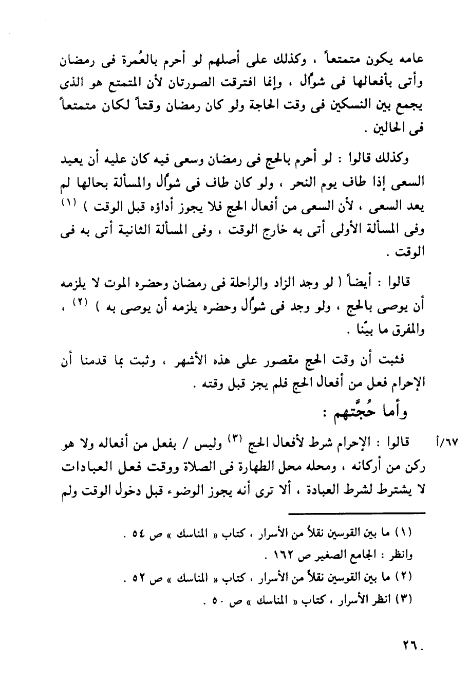 وكذلك قالوا: لو أحرم بالحج في رمضان وسعى فيه كان عليه أن يعيد السعي إذا طاف يوم النحر، ولو كان طاف في شوال والمسألة بحالها لم يعد السعي، لأن السعي من أفعال الحج فلا يجوز أداؤه قبل الوقت) وفي المسألة الأولى أتى به خارج الوقت، وفي المسألة الثانية أتى به في الوقت.