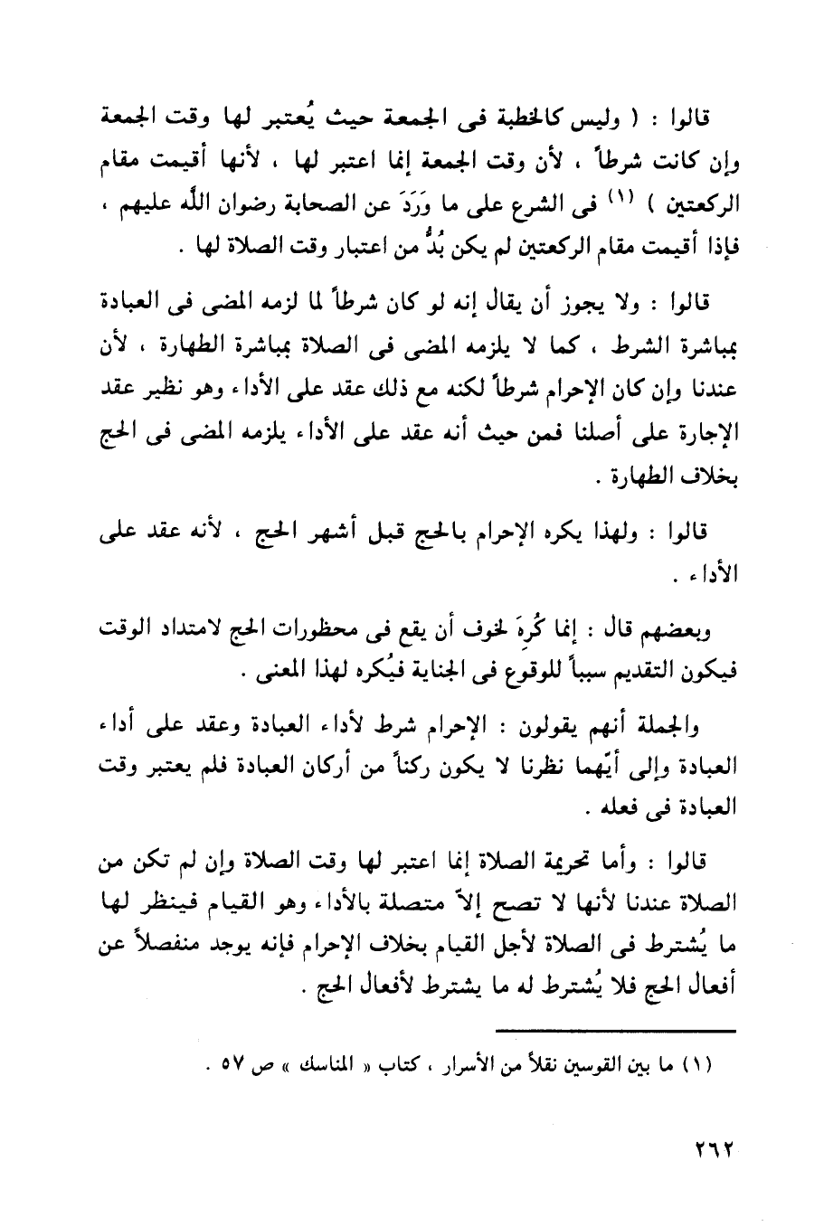 قالوا: ولا يجوز أن يقال إنه لو كان شرطاً لما لزمه المضي في العبادة بمباشرة الشرط، كما لا يلزمه المضي في الصلاة بمباشرة الطهارة، لأن عندنا وإن كان الإحرام شرطاً لكنه مع ذلك عقد على الأداء وهو نظير عقد الإجارة على أصلنا فمن حيث أنه عقد على الأداء يلزمه المضي في الحج بخلاف الطهارة.