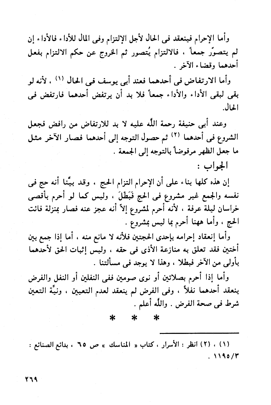 وأما الإحرام فينعقد في الحال لأجل الالتزام وفي المال للأداء فالأداء إن لم يتصور جمعاً، فالالتزام يتصور ثم الخروج عن حكم الالتزام بفعل أحدهما وقضاء الآخر.