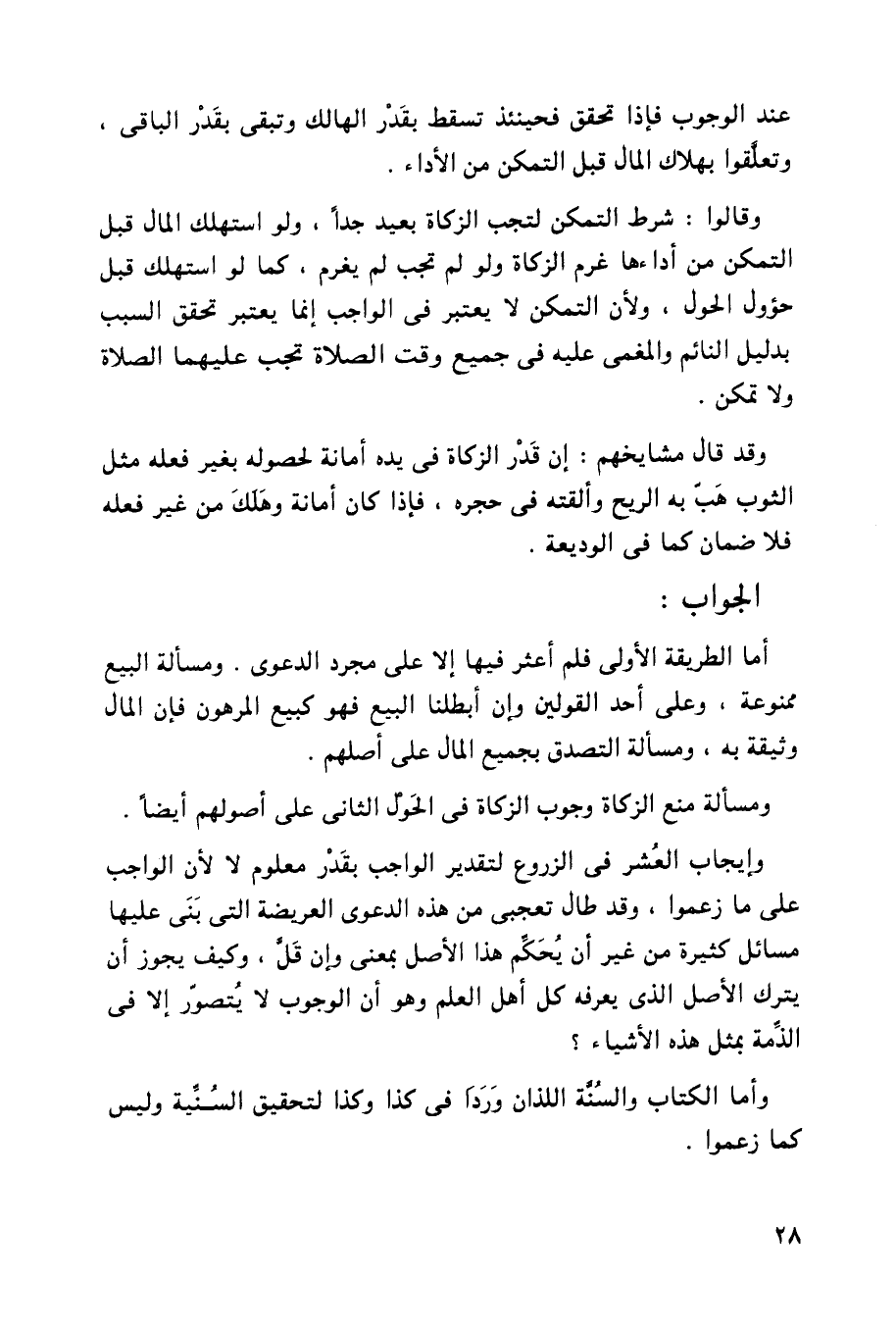 وإيجاب العشر في الزروع لتقدير الواجب بقدر معلوم لا لأن الواجب على ما زعموا، وقد طال تعجبي من هذه الدعوى العريضة التي بنى عليها مسائل كثيرة من غير أن يحكم هذا الأصل بمعنى وإن قل، وكيف يجوز أن يترك الأصل الذي يعرفه كل أهل العلم وهو أن الوجوب لا يتصور إلا في الذمة بمثل هذه الأشياء؟