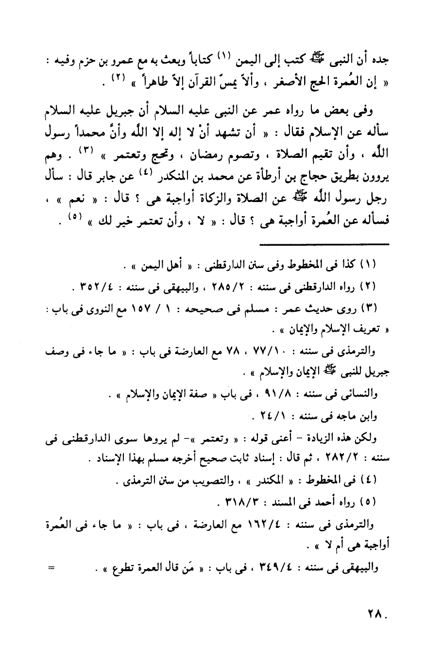 وفي بعض ما رواه عمر عن النبي عليه السلام أن جبريل عليه السلام سأله عن الإسلام فقال: ((أن تشهد أن لا إله إلا الله وأن محمداً رسول الله، وأن تقيم الصلاة، وتصوم رمضان، وتحج وتعتمر)). وهم يروون بطريق حجاج بن أرطأة عن محمد بن المنكدر عن جابر قال: سأل رجل رسول الله - صلى الله عليه وسلم - عن الصلاة والزكاة أواجبة هي؟ قال: ((نعم))، فسأله عن العمرة أواجبة هي؟ قال: ((لا، وأن تعتمر خير لك)).