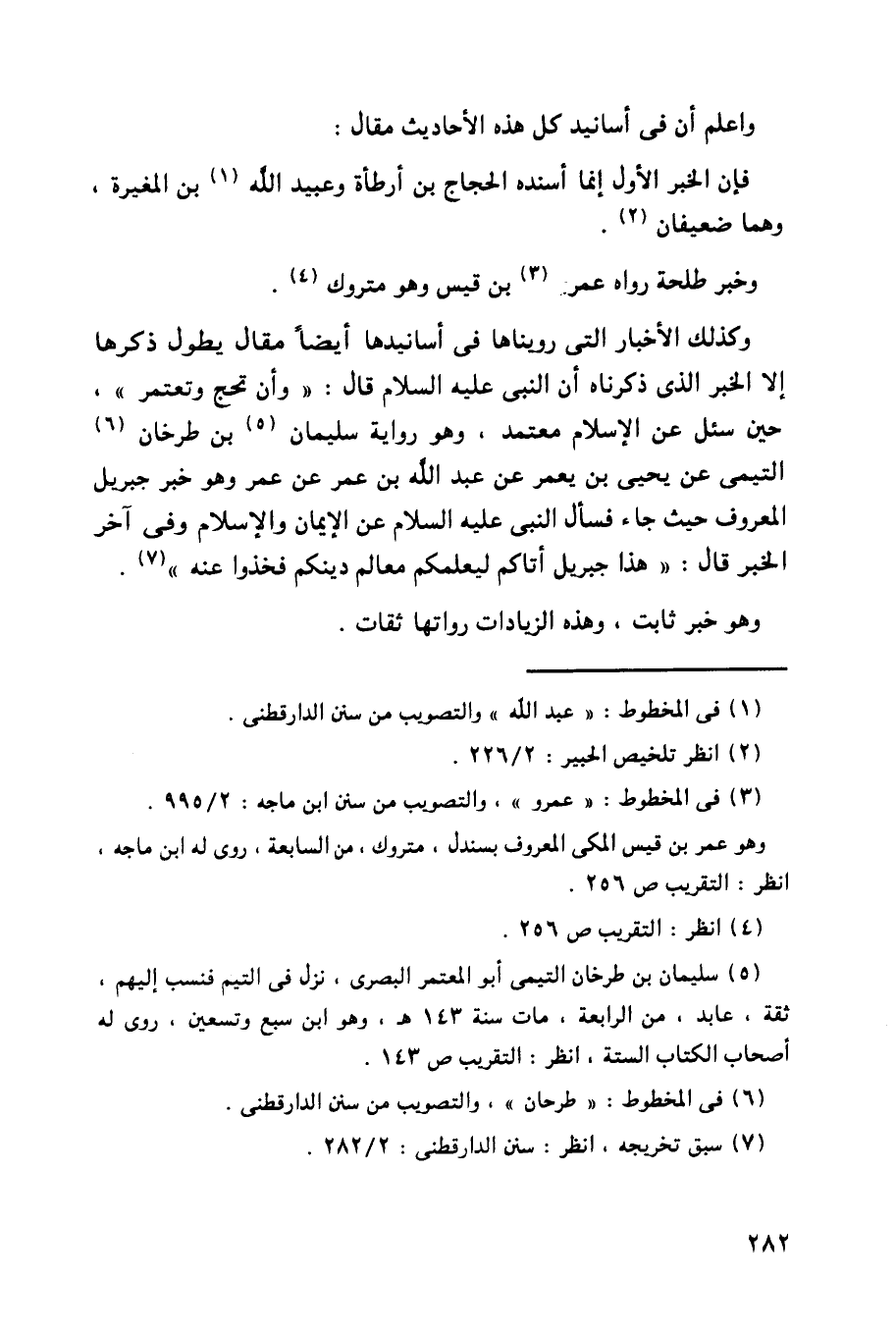 وكذلك الأخبار التي رويناها في أسانيدها أيضاً مقال يطول ذكرها إلا الخبر الذي ذكرناه أن النبي عليه السلام قال: ((وأن تحج وتعتمر))، حين سئل عن الإسلام معتمد، وهو رواية سليمان بن طرخان التيمي عن يحيى بن يعمر عن عبد الله بن عمر عن عمر وهو خبر جبريل المعروف حيث جاء فسأل النبي عليه السلام عن الإيمان والإسلام وفي آخر الخبر قال: ((هذا جبريل أتاكم ليعلمكم معالم دينكم فخذوا عنه)).