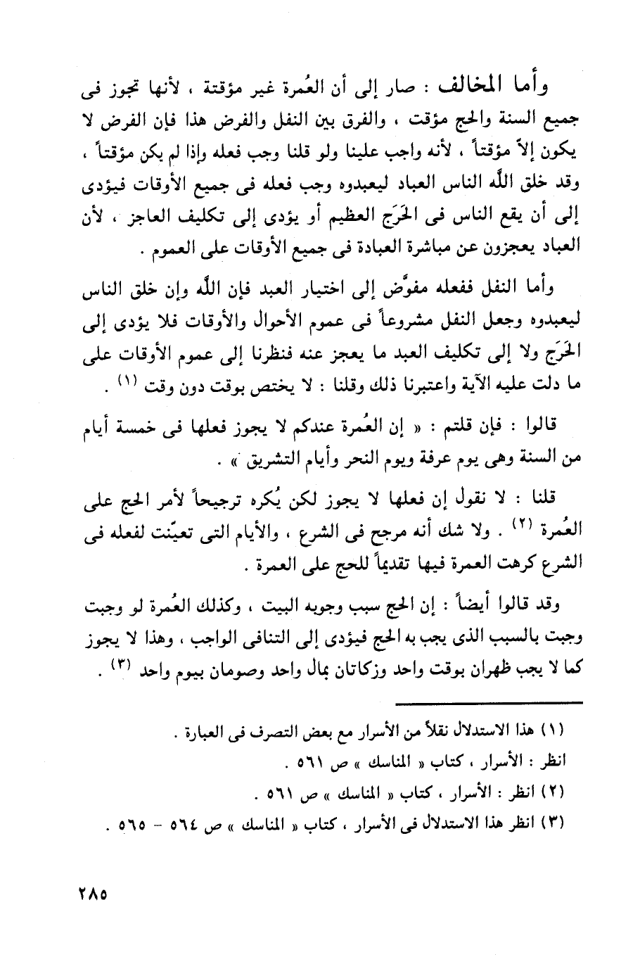 وأما المخالف: صار إلى أن العمرة غير مؤقتة، لأنها تجوز في جميع السنة والحج مؤقت، والفرق بين النفل والفرض هذا فإن الفرض لا يكون إلا مؤقتاً، لأنه واجب علينا ولو قلنا وجب فعله وإذا لم يكن مؤقتاً، وقد خلق الله الناس العباد ليعبدوه وجب فعله في جميع الأوقات فيؤدي إلى أن يقع الناس في الحرج العظيم أو يؤدي إلى تكليف العاجز، لأن العباد يعجزون عن مباشرة العبادة في جميع الأوقات على العموم.