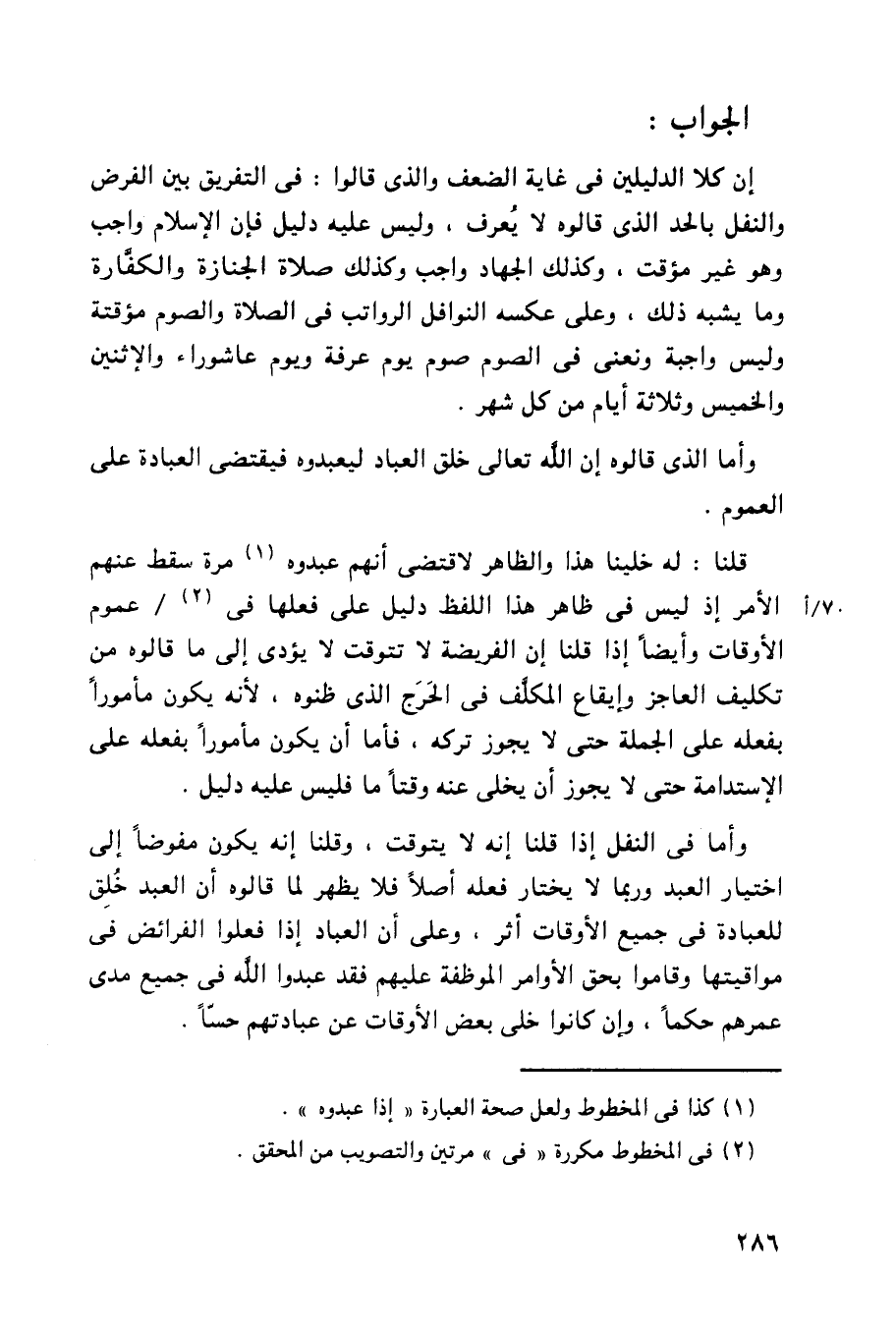 إن كلا الدليلين في غاية الضعف والذي قالوا: في التفريق بين الفرض والنفل بالحد الذي قالوه لا يعرف، وليس عليه فإن الإسلام واجب وهو غير مؤقت، وكذلك الجهاد واجب وكذلك صلاة الجنازة والكفارة وما يشبه ذلك، وعلى عكسه النوافل الرواتب في الصلاة والصوم مؤقتة وليس واجبة ونعني في الصوم صوم يوم عرفة ويوم عاشوراء والاثنين والخميس وثلاثة أيام من كل شهر.