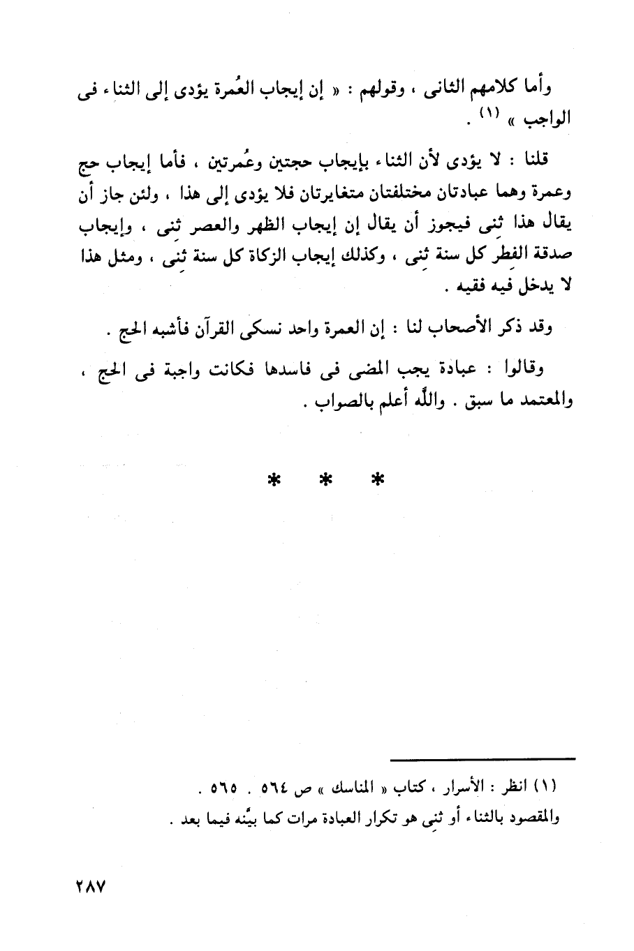 قلنا: لا يؤدي لأن الثناء بإيجاب حجتين وعمرتين، فأما إيجاب حج وعمرة وهما عبادتان مختلفتان متغايرتان فلا يؤدي إلى هذا، ولئن جاز أن يقال هذا ثنى فيجوز أن يقال إن إيجاب الظهر والعصر ثنى، وإيجاب صدقة الفطر لك سنة ثنى، وكذلك إيجاب الزكاة كل سنة ثنى، ومثل هذا لا يدخل فيه فقيه.