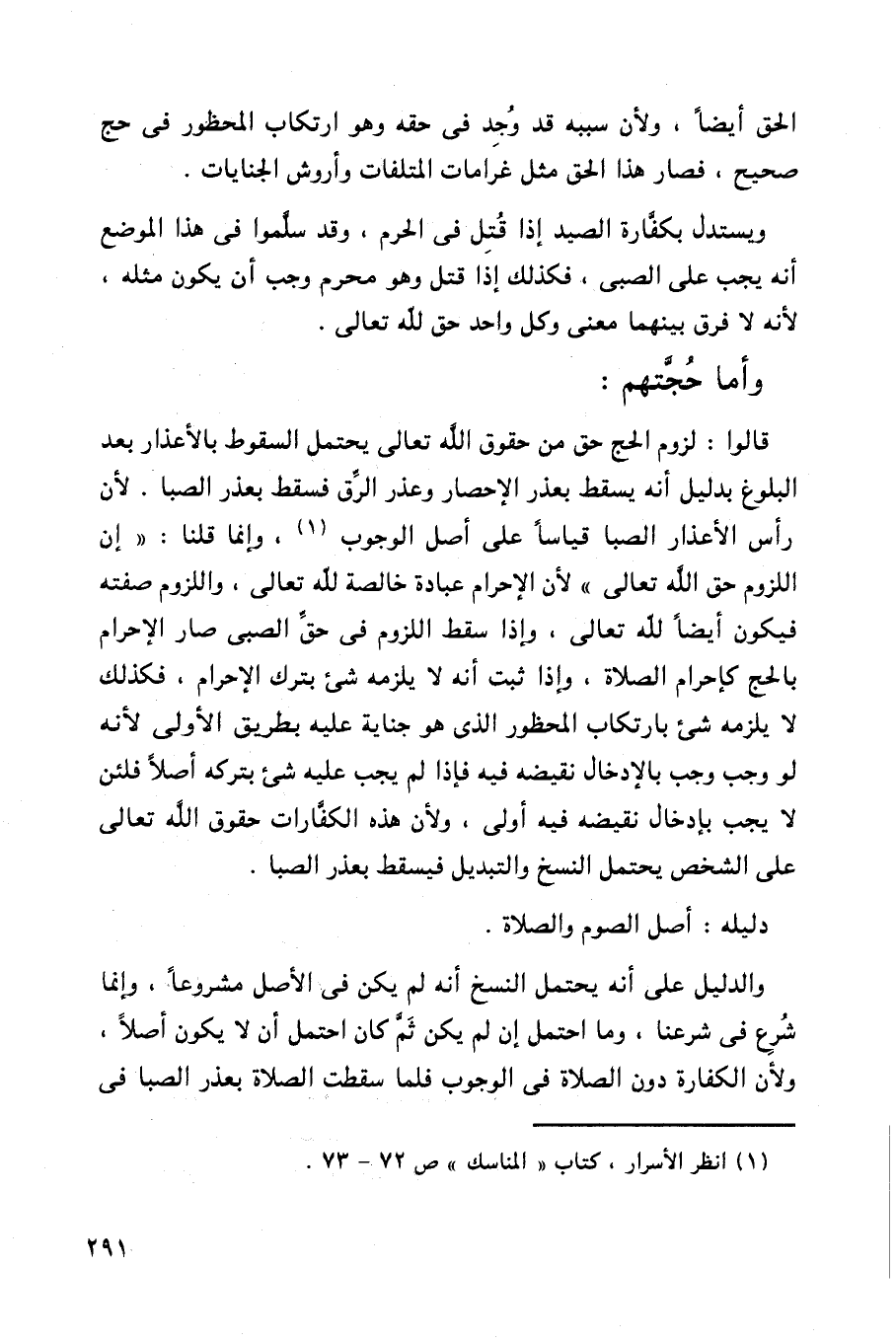 قالوا: لزوم الحج حق من حقوق الله تعالى يحتمل السقوط بالأعذار بعد البلوغ بدليل أنه يسقط بعذر الإحصار وعذر الرق فسقط بعذر الصبا. لأن رأس الأعذار الصبا قياساً على أصل الوجوب، وإنما قلنا: ((إن اللزوم حق الله تعالى)) لأن الإحرام عبادة خالصة لله تعالى، واللزوم صفته فيكون أيضاً لله تعالى، وإذا سقط اللزوم في حق الصبي صار الإحرام بالحج كإحرام الصلاة، وإذا ثبت أنه لا يلزمه شيء بترك الإحرام، فكذلك لا يلزمه شيء بارتكاب المحظور الذي هو جناية عليه بطريق الأولى لأنه لو وجب بالإدخال نقيضه فيه فإذا لم يجب عليه شيء بتركه أصلاً فلئن لا يجب بإدخال نقيضه فيه أولى، ولأن هذه الكفارات حقوق الله تعالى على الشخص يحتمل النسخ والتبديل فيسقط بعذر الصبا.