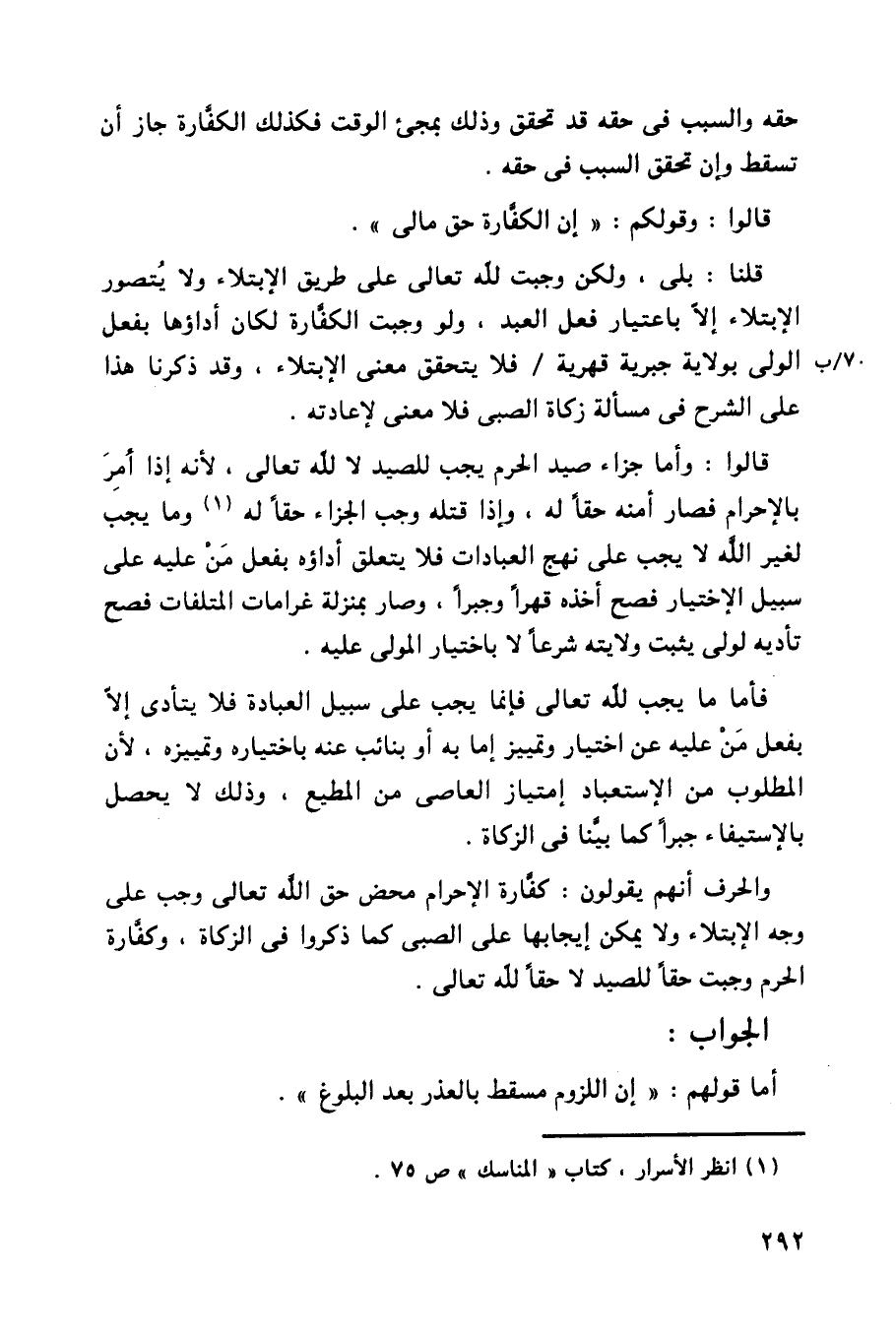 قلنا: بلى، ولكن وجبت لله تعالى على طريق الابتلاء ولا يتصور الابتلاء إلا باعتبار فعل العبد، ولو وجبت الكفارة لكان أداؤها بفعل الولي بولاية جبرية قهرية/ فلا يتحقق معنى الابتلاء، وقد ذكرنا هذا على الشرح في مسألة زكاة الصبي فلا معنى لإعادته.
