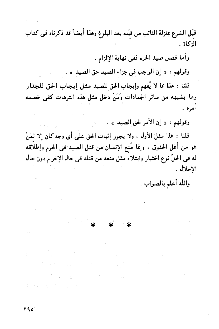 قلنا: هذا مثل الأول، ولا يجوز إثبات الحق على أي وجه كان إلا لمن هو من أهل الحقوق، وإنما منع الإنسان من قتل الصيد في الحرم وإطلاقه له في الحل نوع اختبار وابتلاء مثل منعه من قتله في حال الإحرام دون حال الإحلال.