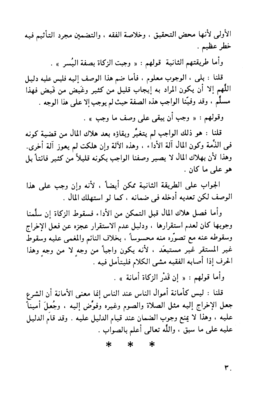 وأما فصل هلاك المال قبل التمكن من الأداء فسقوط الزكاة إن سلمنا وجوبها كان لعدم استقرارها، ودليل عدم الاستقرار عجزه عن فعل الإخراج وسقوطه عنه مع تصوره منه محسوساً، بخلاف النائم والمغمى عليه وسقوط غير المستقر غير مستبعد، لأنه يكون واجباً من وجه لا من وجه وهذا الحرف إذا أصابه الفقيه مشى الكلام فليتأمل فيه.