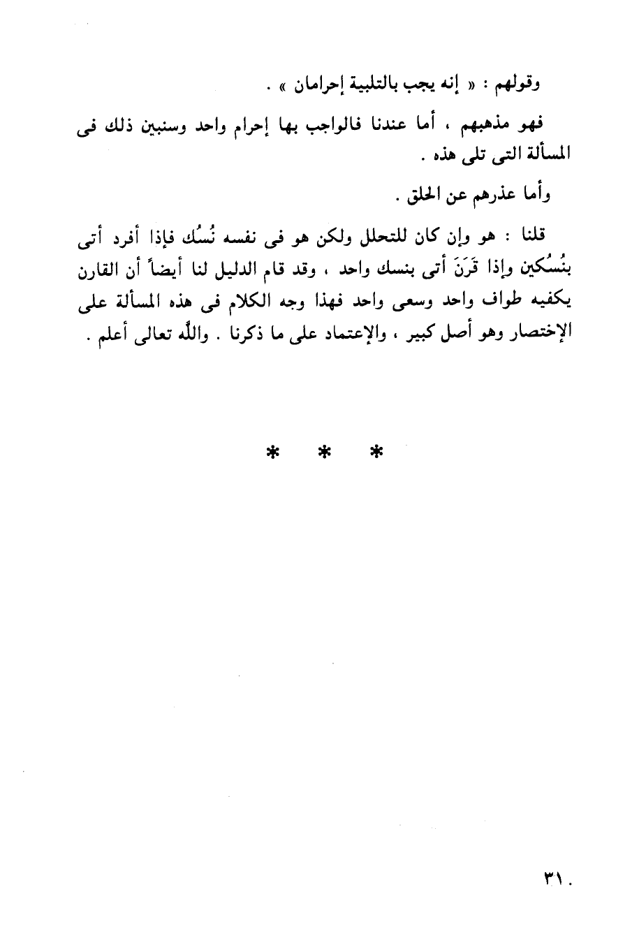 قلنا: هو وإن كان للتحلل ولكن هو في نفسه نسك فإذا أفرد أتى بنسكين وإذا قرن أتى بنسك واحد، وقد قام الدليل لنا أيضاً أن القارن يكفيه طواف واحد وسعى واحد فهذا وجه الكلام في هذه المسألة على الاختصار وهو أصل كبير، والاعتماد على ما ذكرنا. والله تعالى أعلم.