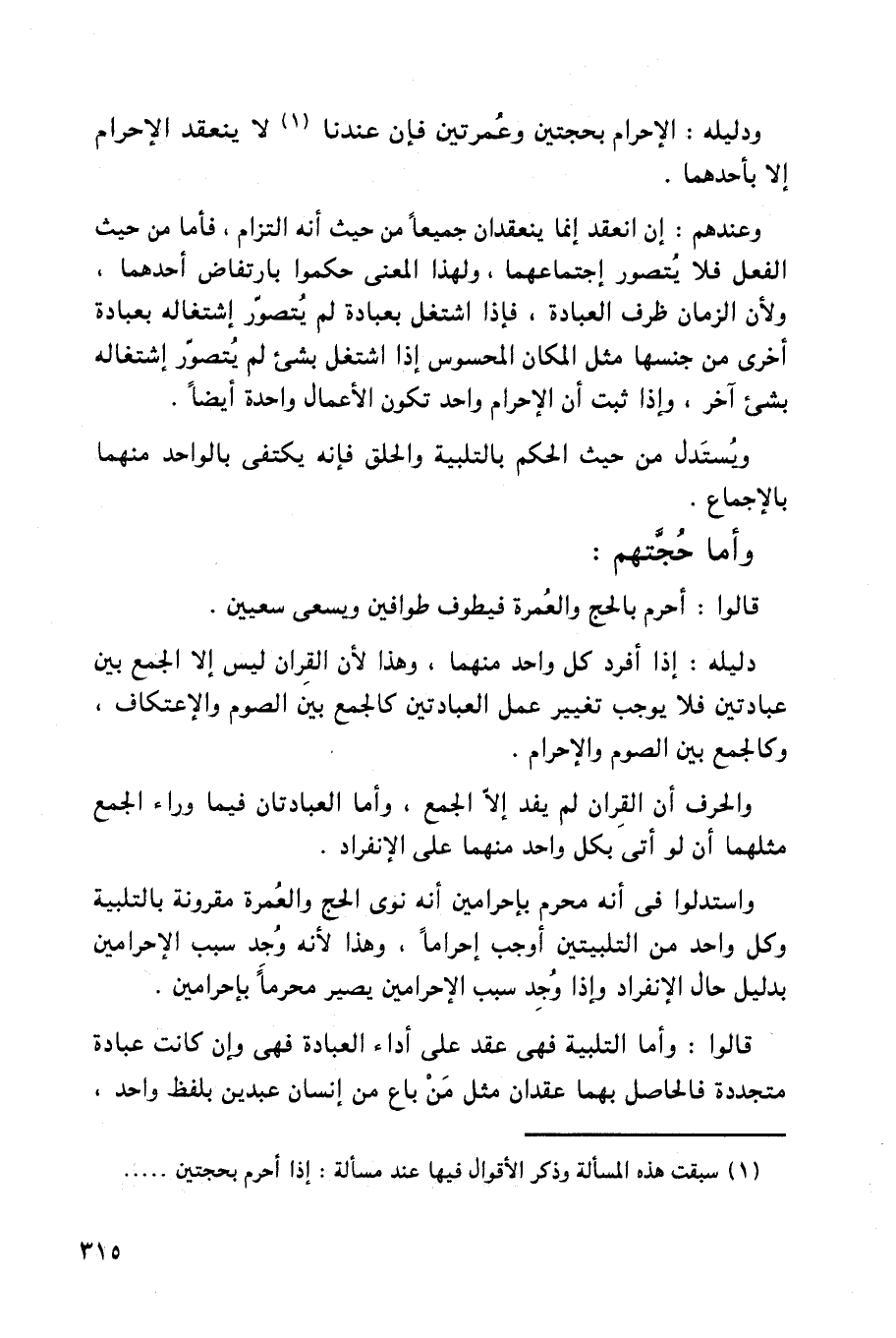 واستدلوا في أنه محرم بإحرامين أنه نوى الحج والعمرة مقرونة بالتلبية وكل واحد من التلبيتين أوجب أحراماً، وهذا لأنه وجد سبب الإحرامين بدليل حال الانفراد وإذا وجد سبب الإحرامين يصير محرماً بإحرامين.