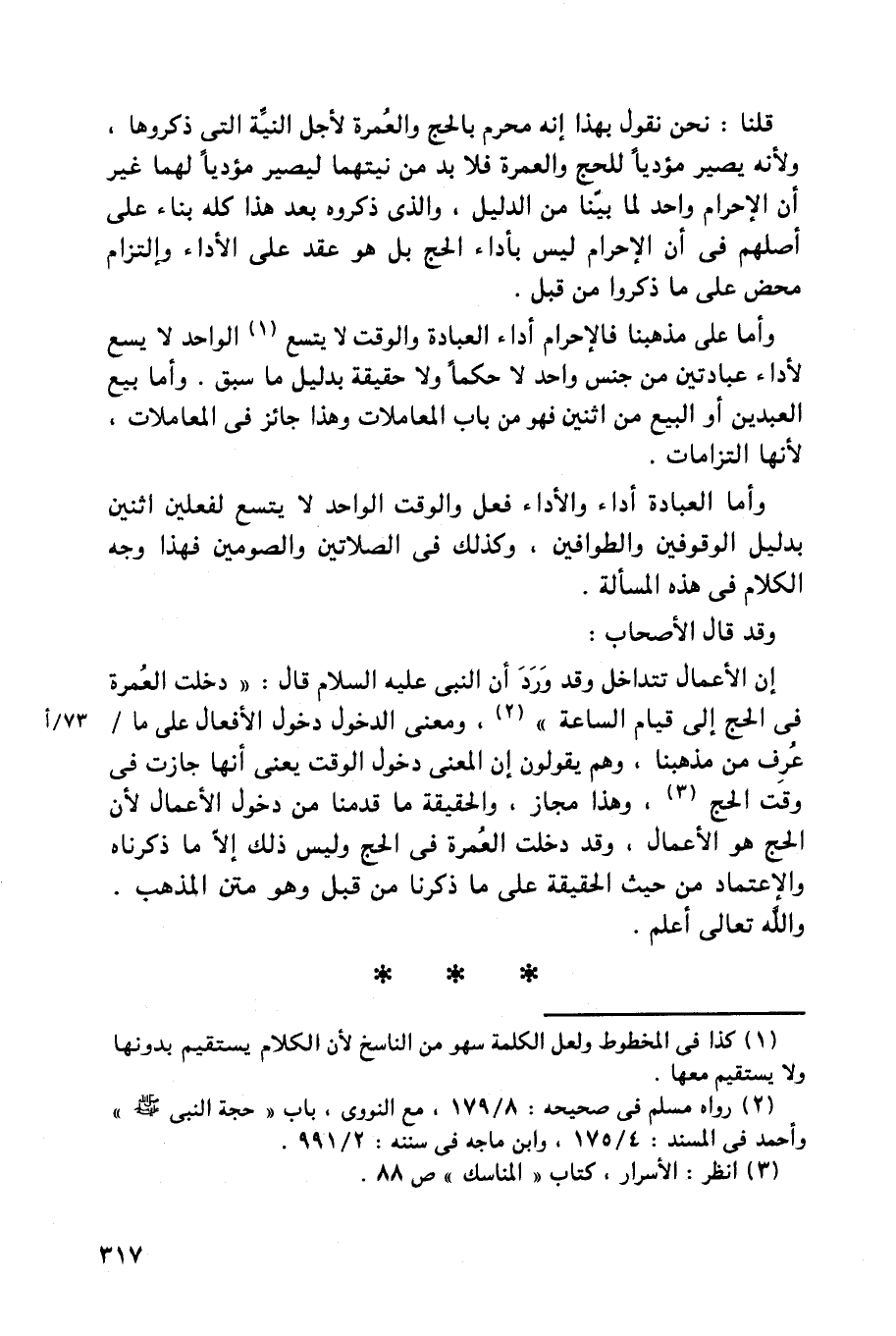 وأما على مذهبنا فالإحرام أداء العبادة والوقت لا يتسع الواحد لا يسع لأداء عبادتين من جنس واحد لا حكماً ولا حقيقة بدليل ما سبق. وأما بيع العبدين أو البيع من اثنين فهو من باب المعاملات وهذا جائز في المعاملات، لأنها التزامات.