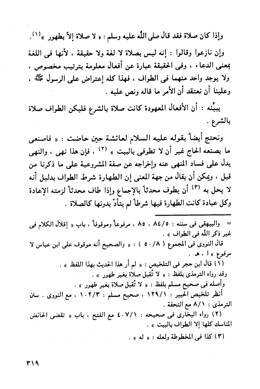 وإن نازعوا وقالوا: إنه ليس بصلاة لا لغة ولا حقيقة، لأنها في اللغة بمعنى الدعاء، وفي الحقيقة عبارة عن أفعال معلومة بترتيب مخصوص، ولا يوجد واحد منهما في الطواف، فهذا كله اعتراض على الرسول - صلى الله عليه وسلم -، وعلينا أن نعتقد أن الأمر ما قاله ونص عليه.