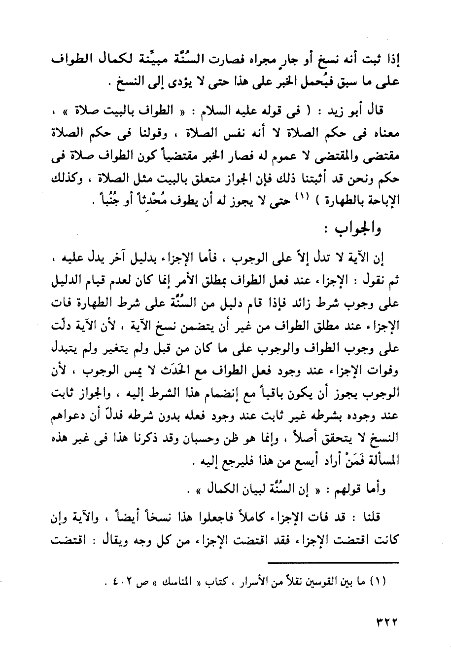 قال أبو زيد: (في قوله عليه السلام: ((الطواف بالبيت صلاة))، معناه في حكم الصلاة لا أنه نفس الصلاة، وقولنا في حكم الصلاة مقتضى والمقتضى لا عموم له فصار الخبر مقتضياً كون الطواف صلاة في حكم ونحن قد أثبتنا ذلك فإن الجواز متعلق بالبيت مثل الصلاة، وكذلك الإباحة بالطهارة) حتى لا يجوز له أن يطوف محدثاً أو جنباً.