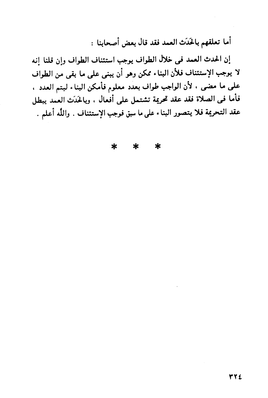 إن الحدث العمد في خلال الطواف يوجب استئناف الطواف وإن قلنا إنه لا يوجب الاستئناف فلأن البناء ممكن وهو أن يبني على ما بقى من الطواف على ما مضى، لأن الواجب طواف بعدد معلوم فأمكن البناء ليتم العدد، فأما في الصلاة فقد عقد تحريمة تشتمل على أفعال، وبالحدث العمد يبطل عقد التحريمة فلا يتصور البناء على ما سبق فوجب الاستئناف. والله أعلم.