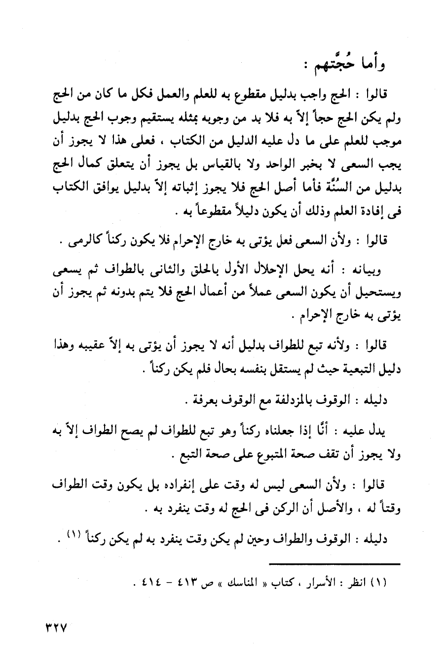 قالوا: الحج واجب بدليل مقطوع به للعلم والعمل فكل ما كان من الحج ولم يكن الحج حجاً إلا به فلابد من وجوبه بمثله يستقيم وجوب الحج بدليل موجب للعلم على ما دل الدليل من الكتاب، فعلى هذا لا يجوز أن يجب السعي لا بخبر الواحد ولا بالقياس بل يجوز أن يتعلق كما الحج بدليل من السنة فأما أصل الحج فلا يجوز إثباته إلا بدليل يوافق الكتاب في إفادة العلم وذلك أن يكون دليلاً مقطوعاً به.