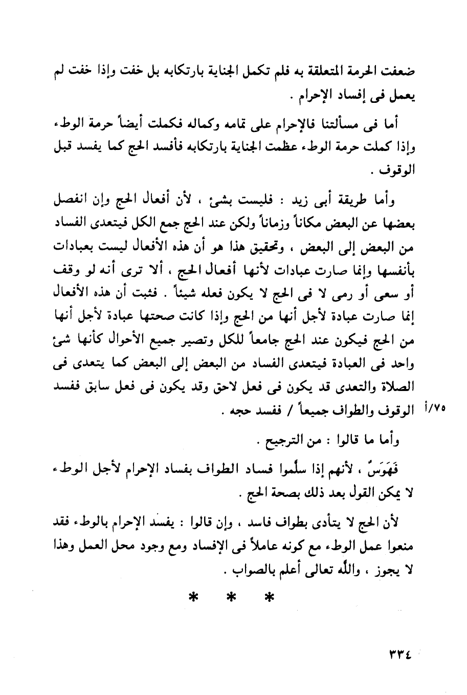 وأما طريقة أبي زيد: فليست بشيء، لأن أفعال الحج وإن انفصل بعضها عن البعض مكاناً وزماناً ولكن عند الحج جمع الكل فيتعدى الفساد من البعض إلى البعض، وتحقيق هذا هو أن هذه الأفعال ليست بعبادات بأنفسها وإنما صارت عبادات لأنها أفعال الحج، ألا ترى أنه لو وقف أو سعى أو رمى لا في الحج لا يكون فعله شيئاً. فثبت أن هذه الأفعال إنما صارت عبادة لأجل أنها من الحج وإذا كانت صحتها عبادة لأجل أنها من الحج فيكون عند الحج جامعاً للكل وتصير جميع الأحوال كأنها شيء واحد في العبادة فيتعدى الفساد من البعض إلى البعض كما يتعدى في الصلاة والتعدي قد يكون في فعل لاحق وقد يكون في فعل سابق ففسد الوقوف والطواف جميعاً/ ففسد حجه.