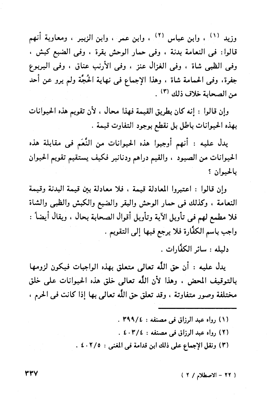 وإن قالوا: اعتبروا المعادلة قيمة، فلا معادلة بين قيمة البدنة وقيمة النعامة، وكذلك في حمار الوحش والبقر والضبع والكبش والظبي والشاة فلا مطمع لهم في تأويل الآية وتأويل أقوال الصحابة بحال، ويقال أيضاً: واجب باسم الكفارة فلا يرجع فيها إلى التقويم.