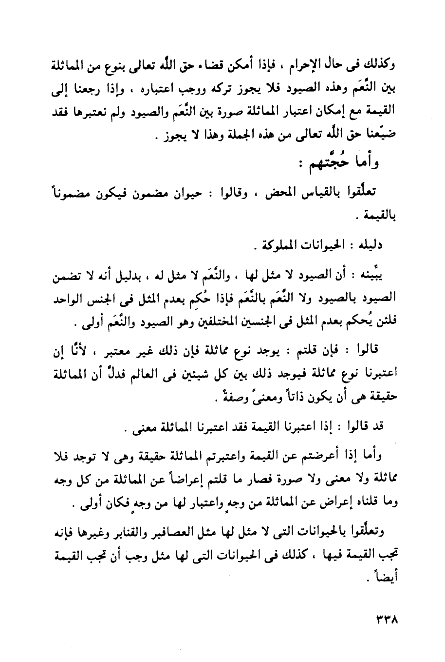 وتعلقوا بالحيوانات التي لا مثل لها مثل العصافير والقنابر وغيرها فإنه تجب القيمة فيها، كذلك في الحيوانات التي لها مثل وجب أن تجب القيمة أيضاً.