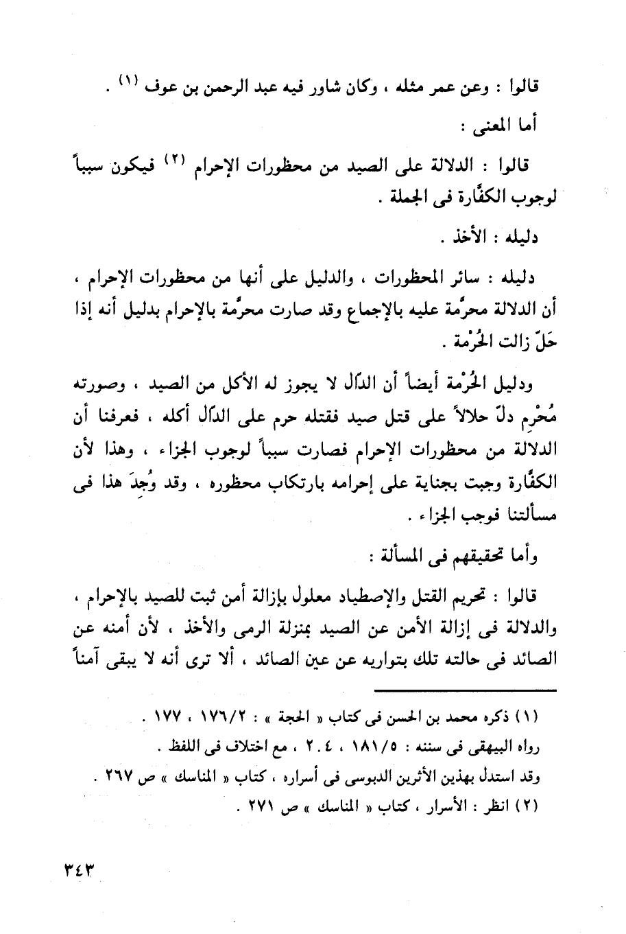 ودليل الحرمة أيضاً أن الدال فلا يجوز له الأكل من الصيد، وصورته محرم دل حلالاً على قتل صيد فقتله حرم على الدال أكله، فعرفنا أن الدلالة من محظورات الإحرام فصارت سبباً لوجوب الجزاء، وهذا لأن الكفارة وجبت بجناية على إحرامه بارتكاب محظوره، وقد وجد هذا في مسألتنا فوجب الجزاء.
