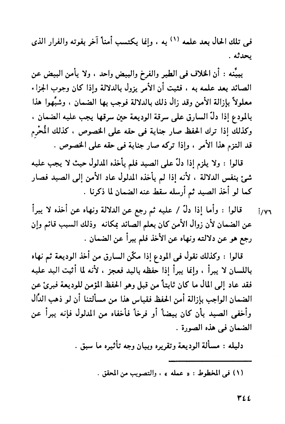 قالوا: وكذلك نقول في المودع إذا مكن السارق من أخذ الوديعة ثم نهاه باللسان لا يبرأ، وإنما يبرأ إذا حفظه باليد فعجز، لأنه لما أثبت اليد عليه فقد عاد إلى المال ما كان ثابتاً من قبل وهو الحفظ المؤمن للوديعة فبرئ عن الضمان الواجب بإزالة أمن الحفظ فقياس هذا من مسألتنا أن لو ذهب الدال وأخفى الصيد بأن كان بيضاً أو فرخاً فأخفاه من المدلول فإنه يبرأ عن الضمان في هذه الصورة.