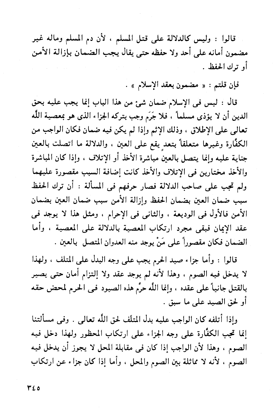 قال: ليس في الإسلام ضمان شيء من هذا الباب إنما يجب عليه بحق الدين أن لا يؤذي مسلماً، فلا جرم وجب بتركه الجزاء الذي هو بمعصية الله تعالى على الإطلاق، وذلك الإثم وإذا لم يكن فيه ضمان فكان الواجب من الكفارة وغيرها متعلقاً بتعقد يقع على العين، والدلالة ما اتصلت بالعين جناية عليه وإنما يتصل بالعين مباشرة الأخذ أو الإتلاف، وإذا كان المباشرة والأخذ مختارين في الإتلاف والأخذ كانت إضافة السبب مقصورة عليهما ولم تجب على صاحب الدلالة فصار حرفهم في المسالة: أن ترك الحفظ سبب ضمان العين بضمان الحفظ وإزالة الأمن سبب ضمان العين بضمان الأمن فالأول في الوديعة، والثاني في الإحرام، ومثل هذا لا يوجد في عقد الإيمان فبقى مجرد ارتكاب المعصية بالدلالة على المعصية، وأما الضمان فكان مقصوراً على من يوجد منه العدوان المتصل بالعين.