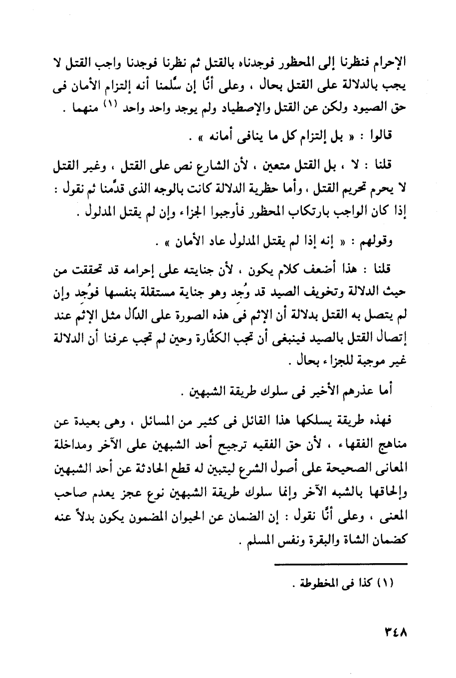 قلنا: هذا أضعف كلام يكون، لأن جنايته على إحرامه قد تحققت من حيث الدلالة وتخويف الصيد قد وجد وهو جناية مستقلة بنفسها فوجد وإن لم يتصل به القتل بدلالة أن الإثم في هذه الصورة على الدال مثل الإثم عند اتصال القتل بالصيد فينبغي أن تجب الكفارة وحين لم تجب عرفنا أن الدلالة غير موجبة للجزاء بحال.