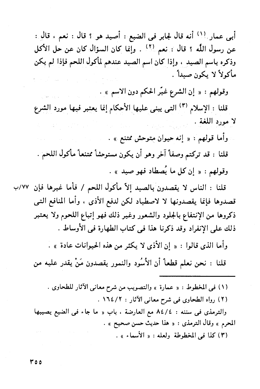 أبي عمار أنه قال لجابر في الضبع: أصيد هو؟ قال: نعم، قال: عن رسول الله؟ قال: نعم. وإنما كان السؤال كان عن حل الأكل وذكره باسم الصيد، وإذا كان اسم الصيد عندهم لمأكول اللحم فإذا لم يكن مأكولاً لا يكون صيداً.