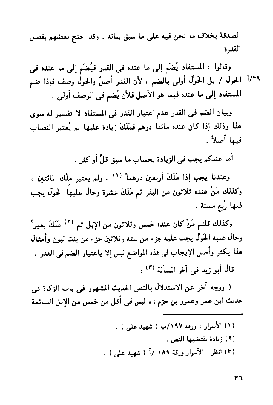 وقالوا: المستفاد يضم إلى ما عنده في القدر فيضم إلى ما عنده في الحول/ بل الحول أولى بالضم، لأن القدر أصل والحول وصف فإذا ضم المستفاد إلى ما عنده فيما هو الأصل فلأن يضم في الوصف أولى.