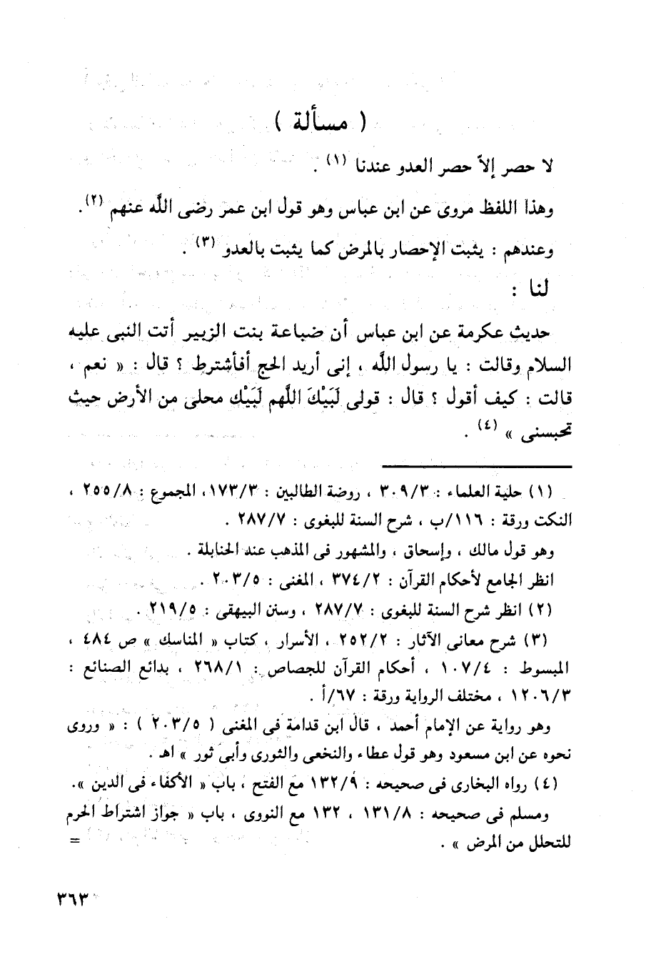حديث عكرمة عن ابن عباس أن ضباعة بنت الزبير أتت النبي عليه السلام وقالت: يا رسول الله، إني أريد الحج أفأشترط؟ قال: ((نعم، قالت: كيف أقول؟ قال: قولي لبيك اللهم لبيك محلي من الأرض حيث تحبسني)).