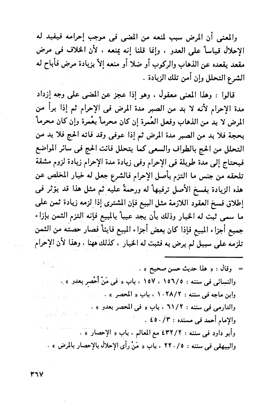 والمعنى أن المرض سبب لمنعه من المضي في موجب إحرامه فيفيد له الإحلال قياساً على العدو، وإنما قلنا إنه يمنعه، لأن الخلاف في مرض مقعد يقعده عن الذهاب والركوب أو ضلا أو منعه إلا بزيادة مرض فأباح له الشرع التحلل وإن أمن تلك الزيادة.