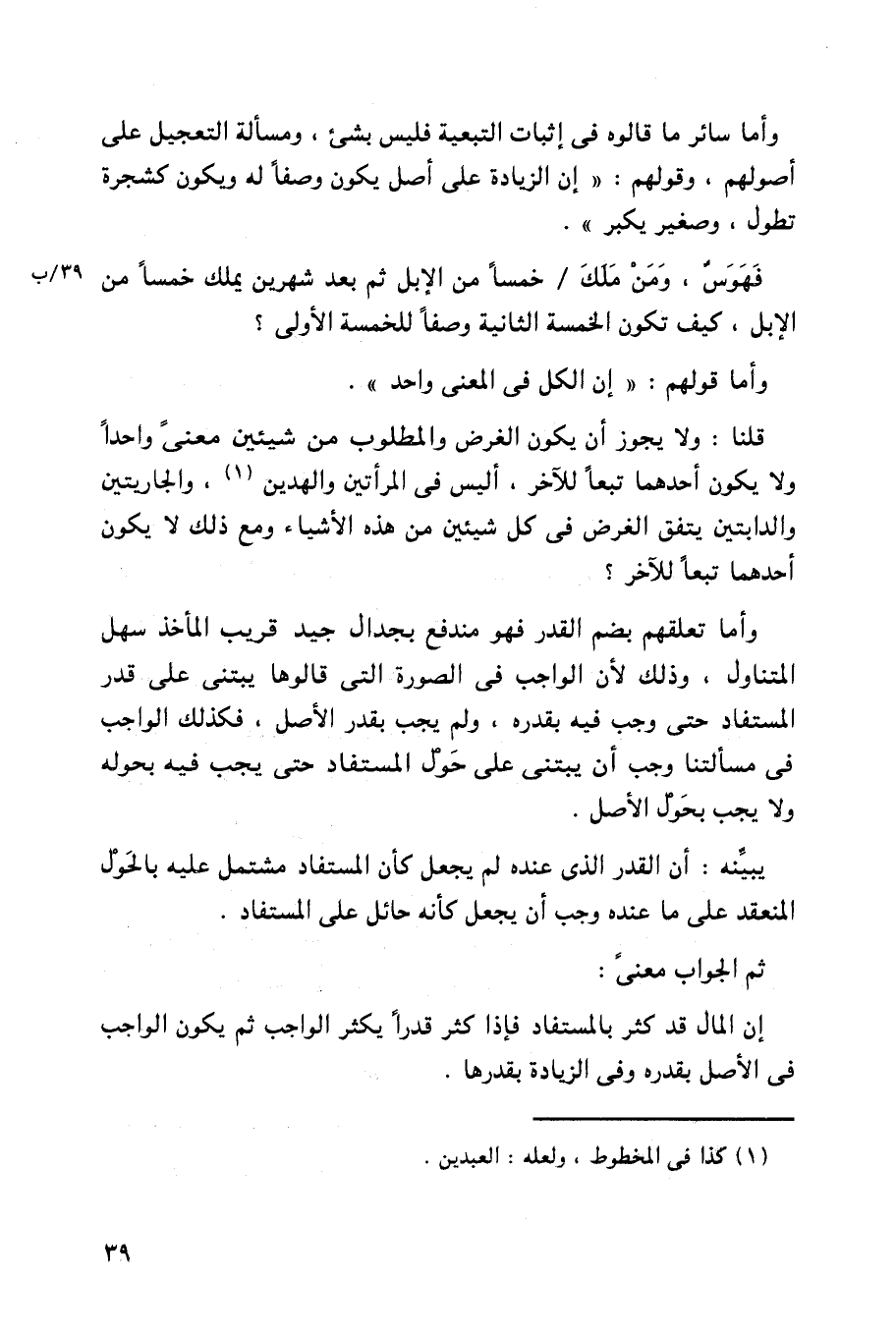 وأما تعلقهم بضم القدر فهو مندفع بجدال جيد قريب المأخذ سهل المتناول، وذلك لأن الواجب في الصورة التي قالوها يبتني على قدر المستفاد حتى وجب فيه بقدره، ولم يجب بقدر الأصل، فكذلك الواجب في مسألتنا وجب أن يبتنى على حول المستفاد حتى يجب فيه بحوله ولا يجب بحول الأصل.