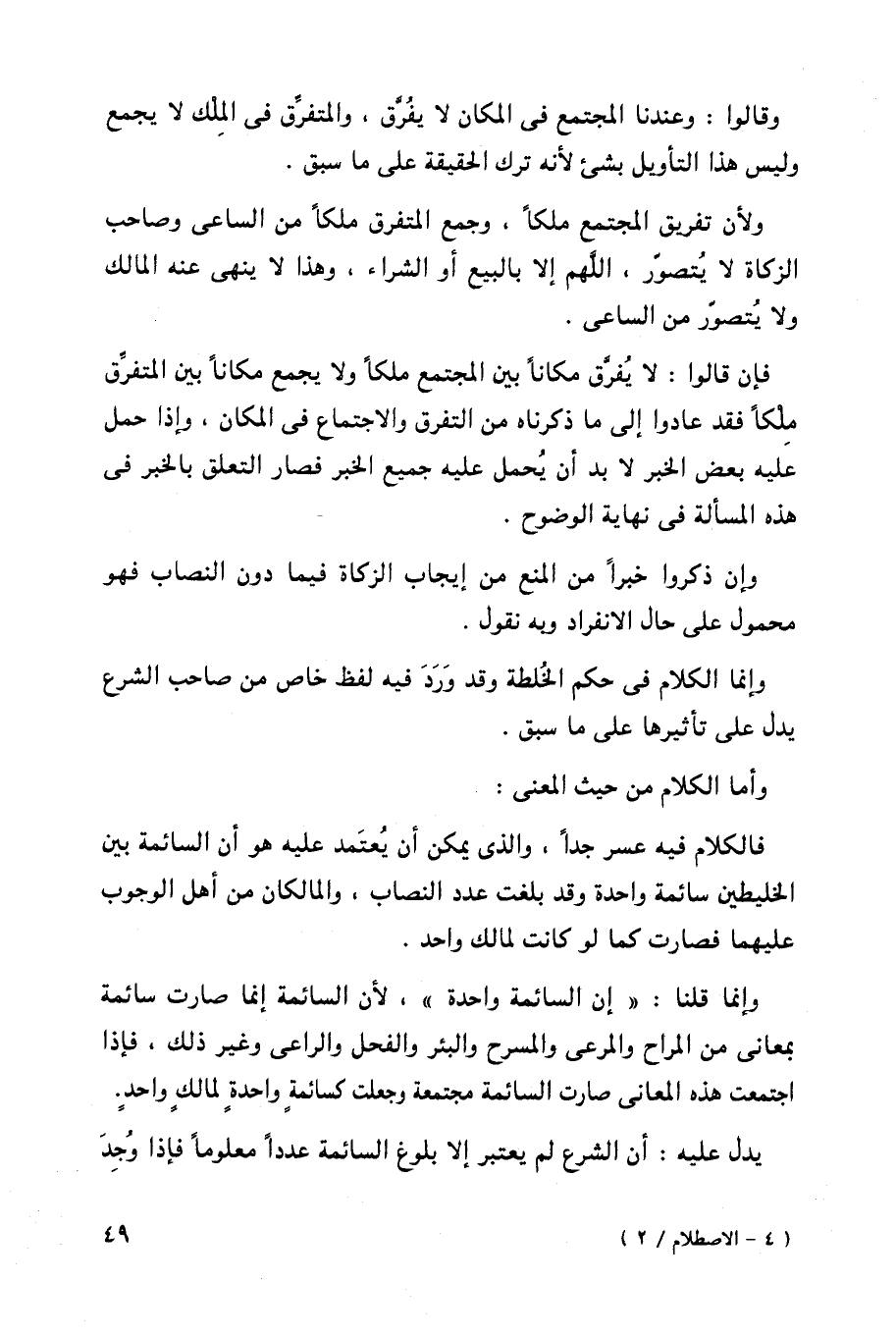 وإنما قلنا: ((إن السائمة واحدة))، لأن السائمة إنما صارت سائمة بمعاني من المراح والمرعي والمسرح والبئر والفحل والراعي وغير ذلك، فإذا اجتمعت هذه المعاني صارت السائمة مجتمعة وجعلت كسائمة واحدة لمالك واحد.