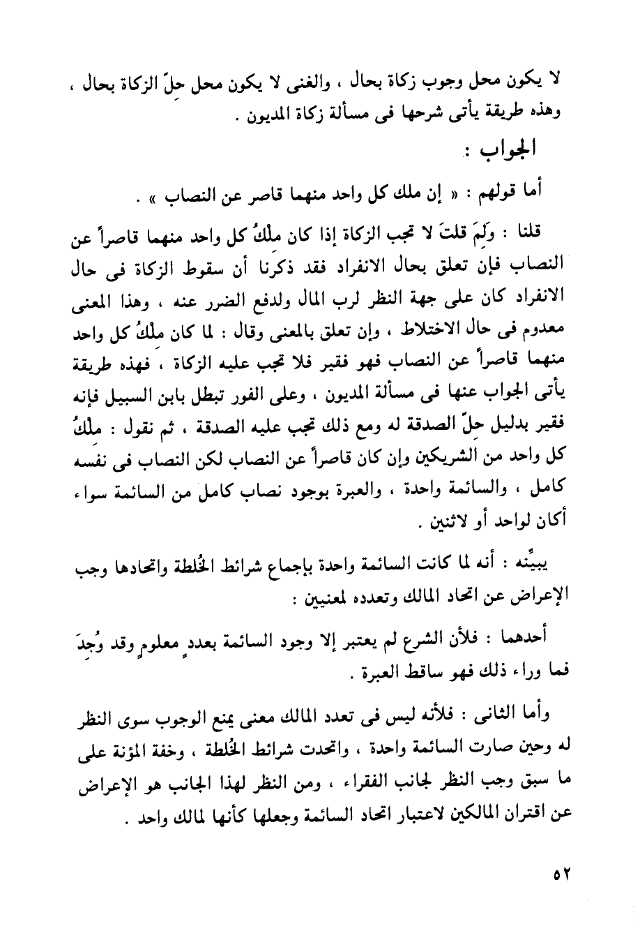 قلنا: ولم قلت لا تجب الزكاة إذا كان ملك كل واحد منهما قاصراً عن النصاب فإن تعلق بحال الانفراد فقد ذكرنا أن سقوط الزكاة في حال الانفراد كان على جهة النظر لرب المال ولدفع الضرر عنه، وهذا المعنى معدوم في حال الاختلاط، وإن تعلق بالمعنى وقال: لما كان ملك كل واحد منهما قاصراً عن النصاب فهو فقير فلا تجب عليه الزكاة، فهذه طريقة يأتي الجواب عنها في مسألة المديون، وعلى الفور تبطل بابن السبيل فإنه فقير بدليل حل الصدقة له ومع ذلك تجب عليه الصدقة، ثم نقول: ملك كل واحد من الشريكين وإن كان قاصراً عن النصاب لكن النصاب في نفسه كامل، والسائمة واحدة، والعبرة بوجوب نصاب كامل من السائمة سواء أكان لواحد أو لاثنين.