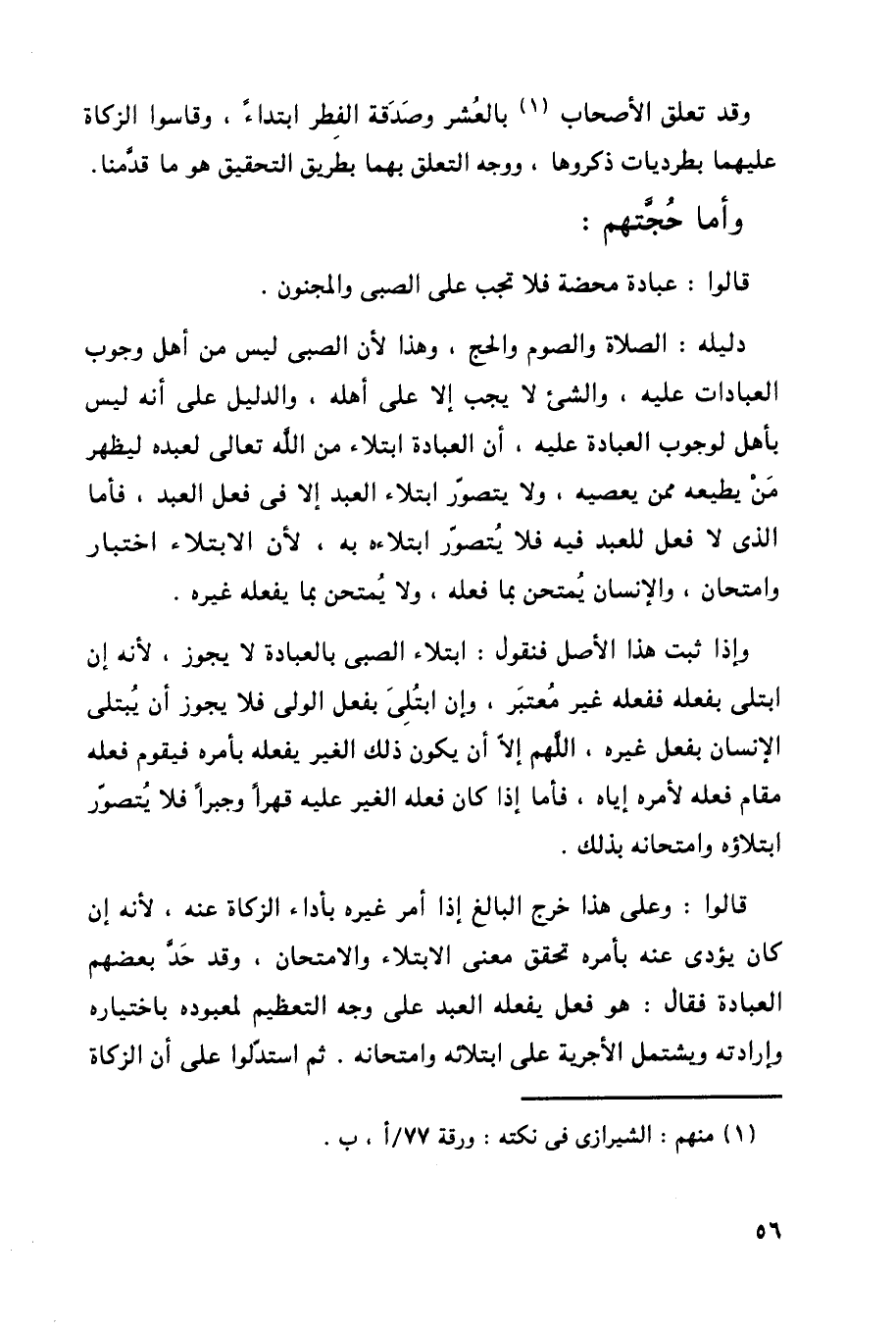 قالوا: وعلى هذا خرج البالغ إذا أمر غيره بأداء الزكاة عنه، لأنه إن كان يؤدى عنه بأمره تحقق معنى الابتلاء والامتحان، وقد حد بعضهم العبادة فقال: هو فعل يفعله العبد على وجه التعظيم لمعبوده باختياره وإرادته ويشتمل الأجرية على ابتلائه وامتحانه. ثم استدلوا على أن الزكاة