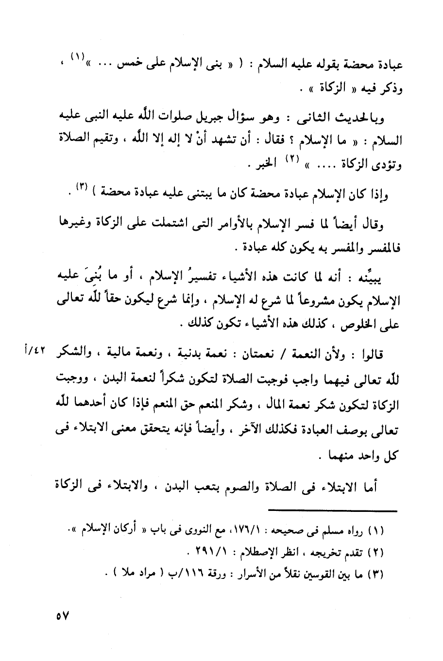 وقال أيضاً لما فسر الإسلام بالأوامر التي اشتملت على الزكاة وغيرها فالمفسر والمفسر به يكون كله عبادة.