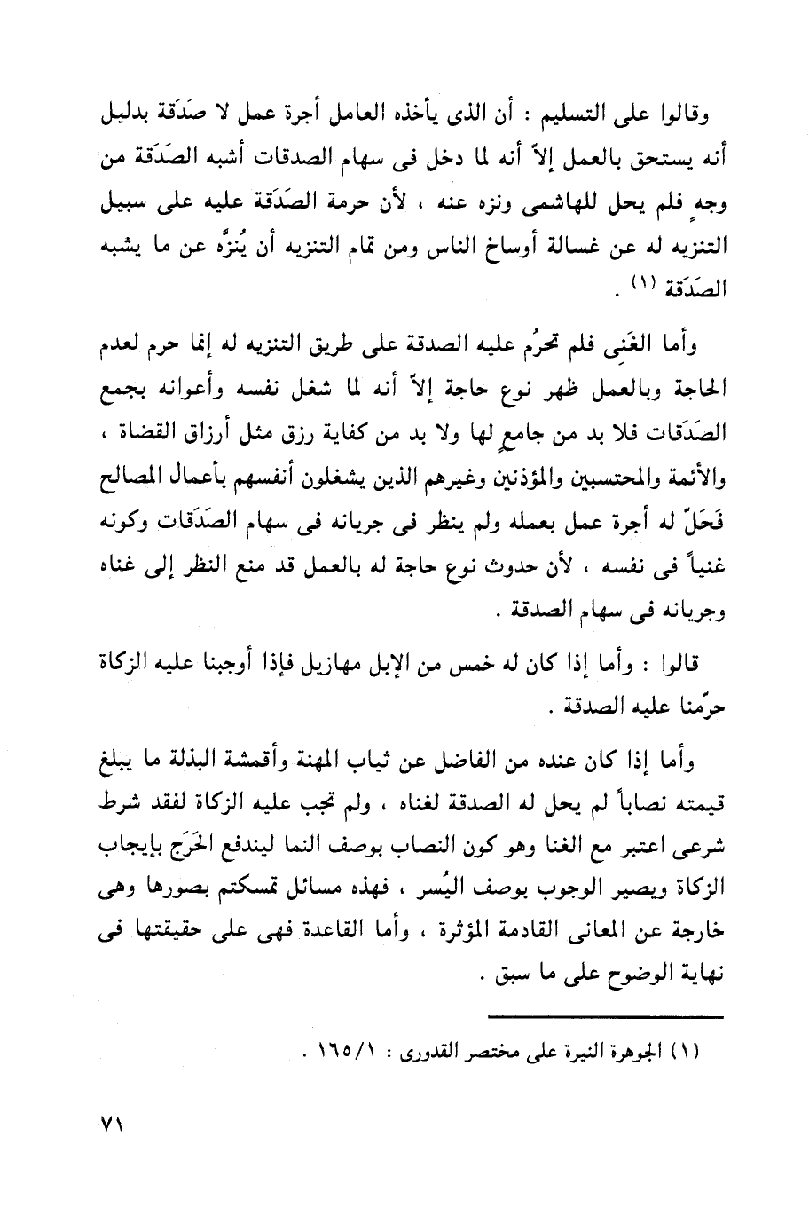 وأما إذا كان عنده من الفاضل عن ثياب المهنة وأقمشة البذلة ما يبلغ قيمته نصاباً لم يحل له الصدقة لغناه، ولم تجب عليه الزكاة لفقد شرط شرعي اعتبر مع الغنا وهو كون النصاب بوصف النما ليندفع الحرج بإيجاب الزكاة ويصير الوجوب بوصف اليسر، فهذه مسائل تمسكتم بصورها وهي خارجة عن المعاني القادمة المؤثرة، وأما القاعدة فهي على حقيقتها في نهاية الوضوح على ما سبق.