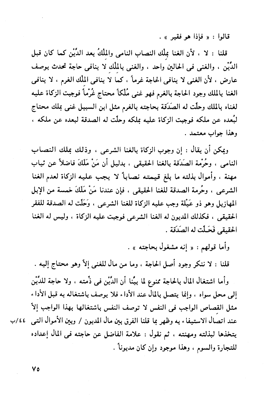 قلنا: لا، لأن الغنا بملك النصاب النامي والملك بعد الدين كما كان قبل الدين، والغنى في الحالين واحد، والغنى بالملك لا ينافي حاجة تحدث بوصف عارض، لأن الغنى لا ينافي الحاجة غرماً، كما لا ينافي الملك الغرم، لا ينافي الغنا بالملك وجود الحاجة بالغرم فهو غنى ملكاً محتاج غرماً فوجب الزكاة عليه لغناه بالملك وحلت له الصدقة بحاجته بالغرم مثل ابن السبيل غنى بملك محتاج لبعده عن ملكه فوجبت الزكاة عليه بملكه وحلت له الصدقة لبعده عن ملكه، وهذا جواب معتمد.