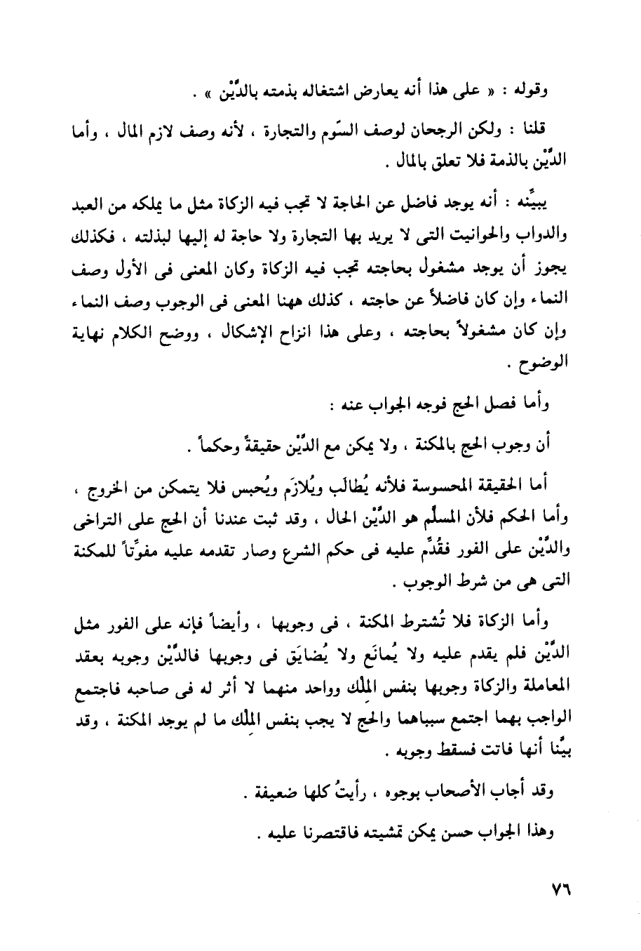 يبينه: أنه يوجد فاضل عن الحاجة لا تجب فيه الزكاة مثل ما يملكه من العبد والدواب والحوانيت التي لا يريد بها التجارة ولا حاجة له إليها لبذلته، فكذلك يجوز أن يوجد مشغول بحاجته تجب فيه الزكاة وكان المعنى في الأول وصف النماء وإن كان فاضلاً عن حاجته، وكذلك ههنا المعنى في الوجوب وصف النماء وإن كان مشغولاً بحاجته، وعلى هذا انزاح الإشكال، ووضح الكلام نهاية الوضوح.