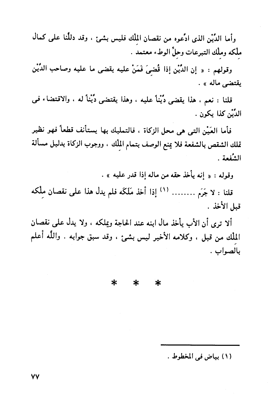 ألا ترى ن الأب يأخذ مال ابنه عند الحاجة ويملكه، ولا يدل على نقصان الملك من قبل، وكلامه الأخير ليس بشيء، وقد سبق جوابه. والله أعلم بالصواب.