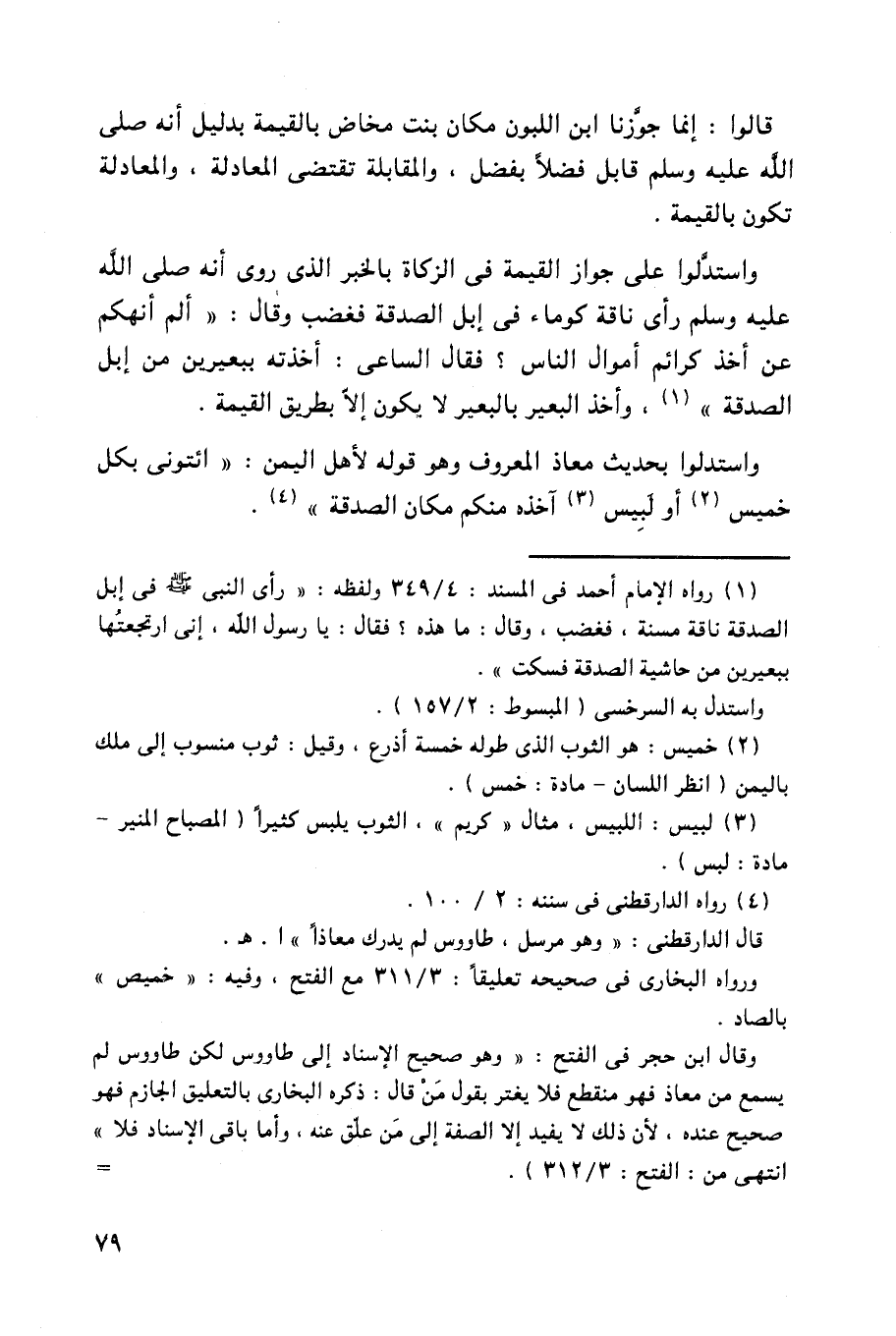 واستدلوا على جواز القيمة في الزكاة بالخبر الذى روى أنه صلى الله عليه وسلم رأى ناقة كوماء في إبل الصدقة فغضب وقال: ((ألم أنهكم عن أخذ كرائم أموال الناس؟ فقال الساعي: أخذته ببعيرين من إبل الصدقة))، وأخذ البعير لا يكون إلا بطريق القيمة.