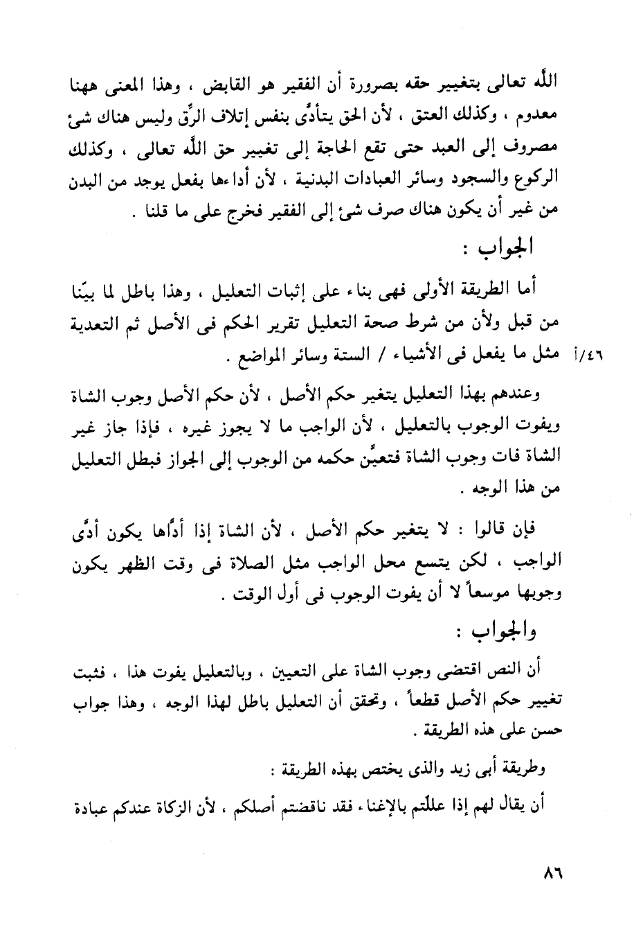 أن النص اقتضى وجوب الشاة على التعيين، وبالتعليل يفوت هذا، فثبت تغيير حكم الأصل قطعاً، وتحقق أن التعليل باطل لهذا الوجه، وهذا جواب حسن على هذه الطريقة.