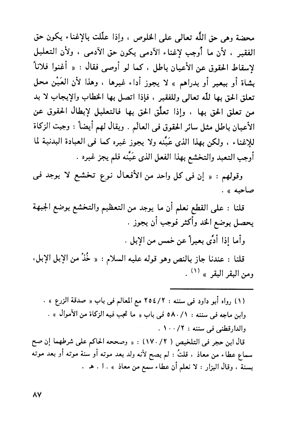 محضة وهي حق الله تعالى على الخلوص، وإذا عللت بالإغناء يكون حق الفقير، لأن ما أوجب لإغناء الآدمي يكون حق الآدمي، ولأن التعليل لإسقاط الحقوق عن الأعيان باطل، كما لو أوصى فقال: ((أغنوا فلاناً بشاة أو ببعير أو بدراهم)) لا يجوز أداء غيرها، وهذا لأن العين محل تعلق الحق بها لله تعالى وللفقير، فإذا اتصل بها الخطاب والإيجاب لابد من تعلق الحق بها، وإذا تعلق الحق بها فالتعليل لإبطال الحقوق عن الأعيان باطل مثل سائر الحقوق في العالم. ويقال لهم أيضاً: وجبت الزكاة للإغناء، ولكن بهذا الذي عينه ولا يجوز غيره كما في العبادة البدنية لما أوجب التعبد والتخشع بهذا الفعل الذي عينه فلم يجز غيره.