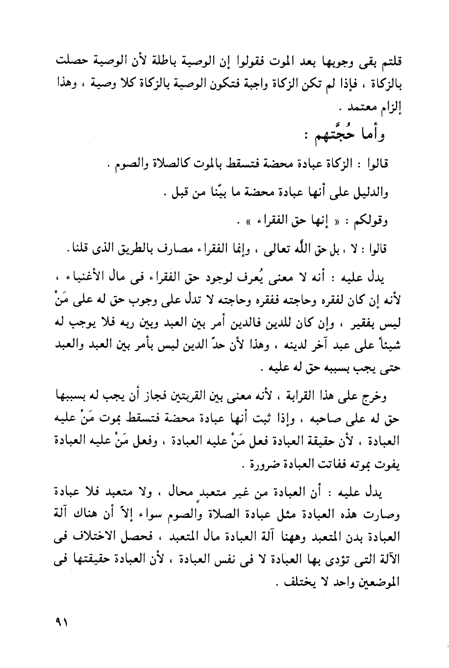قلتم بقي وجوبها بعد الموت فقولوا إن الوصية باطلة لأن الوصية حصلت بالزكاة، فإذا لم تكن الزكاة واجبة فتكون الوصية بالزكاة كلا وصية، وهذا إلزام معتمد.