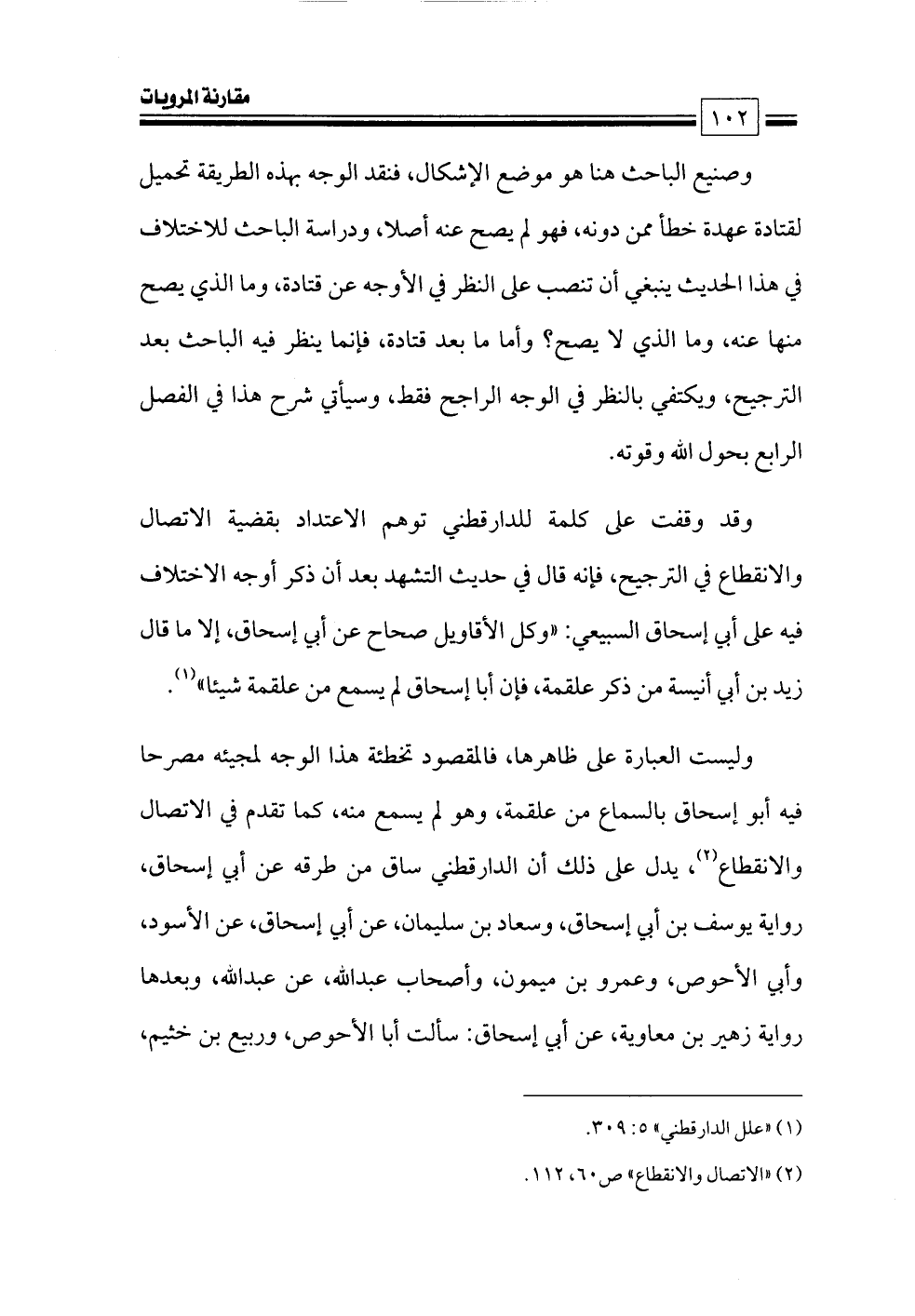 وقد وقفت على كلمة للدارقطني توهم الاعتداد بقضية الاتصال والانقطاع في الترجيح، فإنه قال في حديث التشهد بعد أن ذكر أوجه الاختلاف فيه على أبي إسحاق السبيعي: «وكل الأقاويل صحاح عن أبي إسحاق, إلا ما قال زيد بن أبي أنيسة من ذكر علقمة، فإن أبا إسحاق لم يسمع من علقمة شيئا» (¬١).