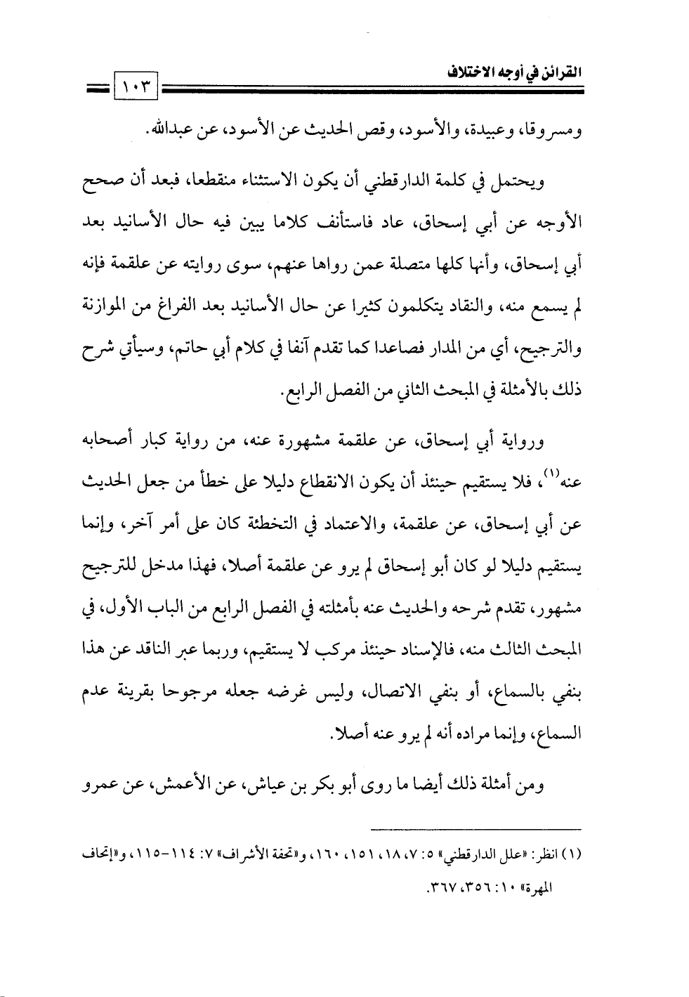 ويحتمل في كلمة الدارقطني أن يكون الاستثناء منقطعا, فبعد أن صحح الأوجه عن أبي إسحاق، عاد فاستأنف كلاما يبين فيه حال الأسانيد بعد أبي إسحاق، وأنها كلها متصلة عمن رواها عنهم، سوى روايته عن علقمة فإنه لم يسمع منه، والنقاد يتكلمون كثيرا عن حال الأسانيد بعد الفراغ من الموازنة والترجيح، أي من المدار فصاعدا كما تقدم آنفا في كلام أبي حاتم، وسيأتي شرح ذلك بالأمثلة في المبحث الثاني من الفصل الرابع.