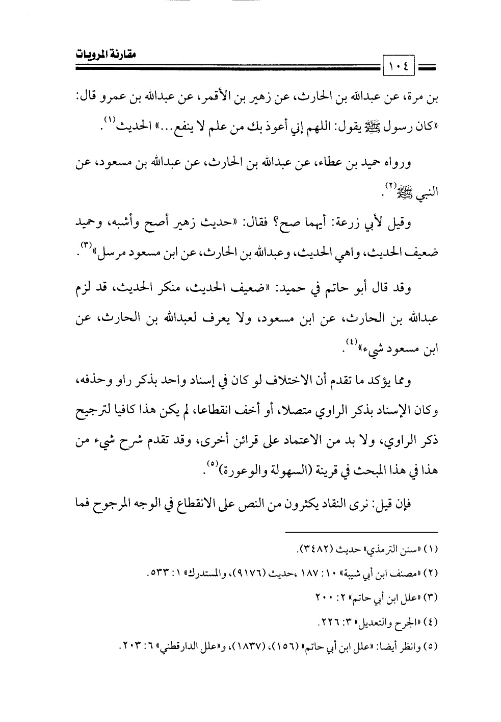 وقيل لأبي زرعة: أيهما صح؟ فقال: «حديث زهير أصح وأشبه, وحميد ضعيف الحديث, واهي الحديث, وعبدالله بن الحارث، عن ابن مسعود مرسل» (¬٣).