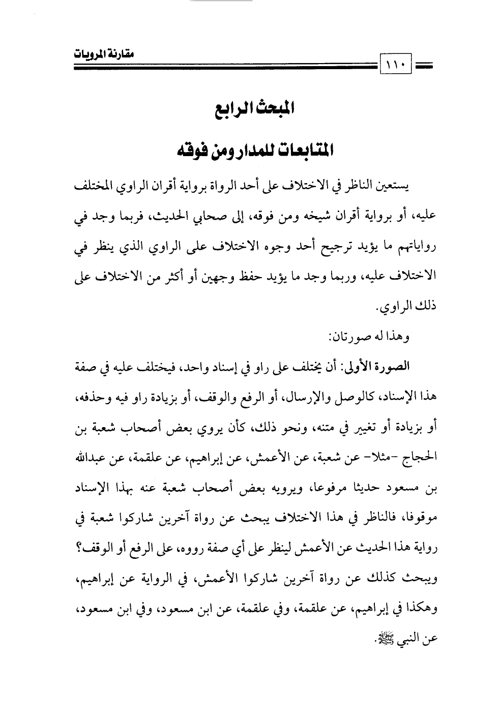 الصورة الأولى: أن يختلف على راو في إسناد واحد, فيختلف عليه في صفة هذا الإسناد، كالوصل والإرسال, أو الرفع والوقف، أو بزيادة راو فيه وحذفه, أو بزيادة أو تغيير في متنه، ونحو ذلك, كأن يروي بعض أصحاب شعبة بن الحجاج -مثلا- عن شعبة, عن الأعمش, عن إبراهيم, عن علقمة، عن عبدالله بن مسعود حديثا مرفوعا, ويرويه بعض أصحاب شعبة عنه بهذا الإسناد موقوفا, فالناظر في هذا الاختلاف يبحث عن رواة آخرين شاركوا شعبة في رواية هذا الحديث عن الأعمش لينظر على أي صفة رووه، على الرفع أو الوقف؟ ويبحث كذلك عن رواة آخرين شاركوا الأعمش, في الرواية عن إبراهيم, وهكذا في إبراهيم, عن علقمة، وفي علقمة, عن ابن مسعود، وفي ابن مسعود, عن النبي - صلى الله عليه وسلم -.