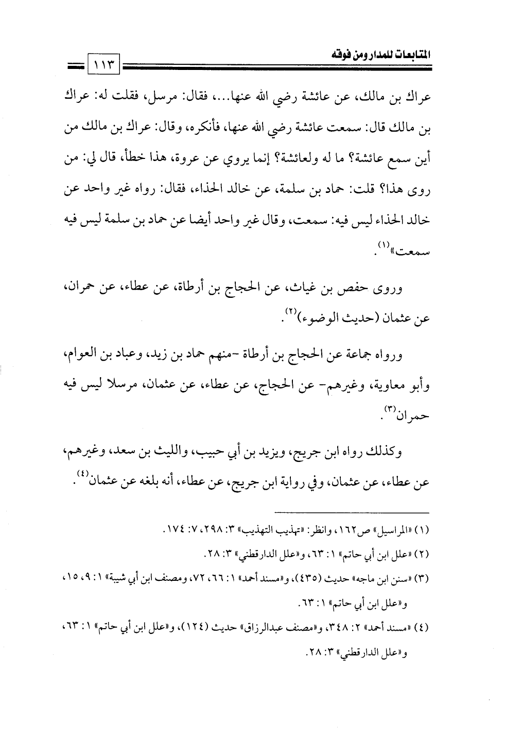 ورواه جماعة عن الحجاج بن أرطاة -منهم حماد بن زيد, وعباد بن العوام, وأبو معاوية, وغيرهم- عن الحجاج, عن عطاء, عن عثمان, مرسلا ليس فيه حمران (¬٣).